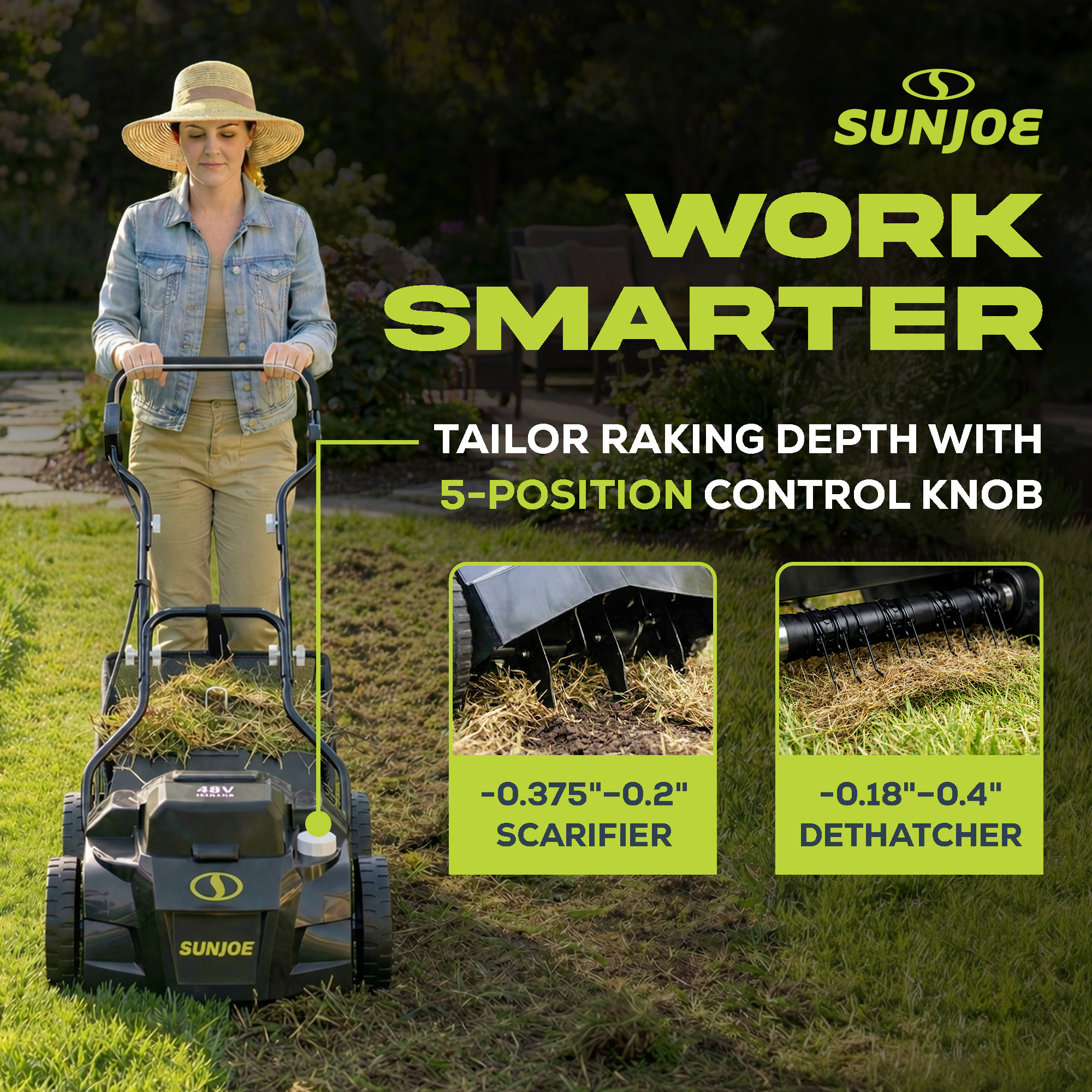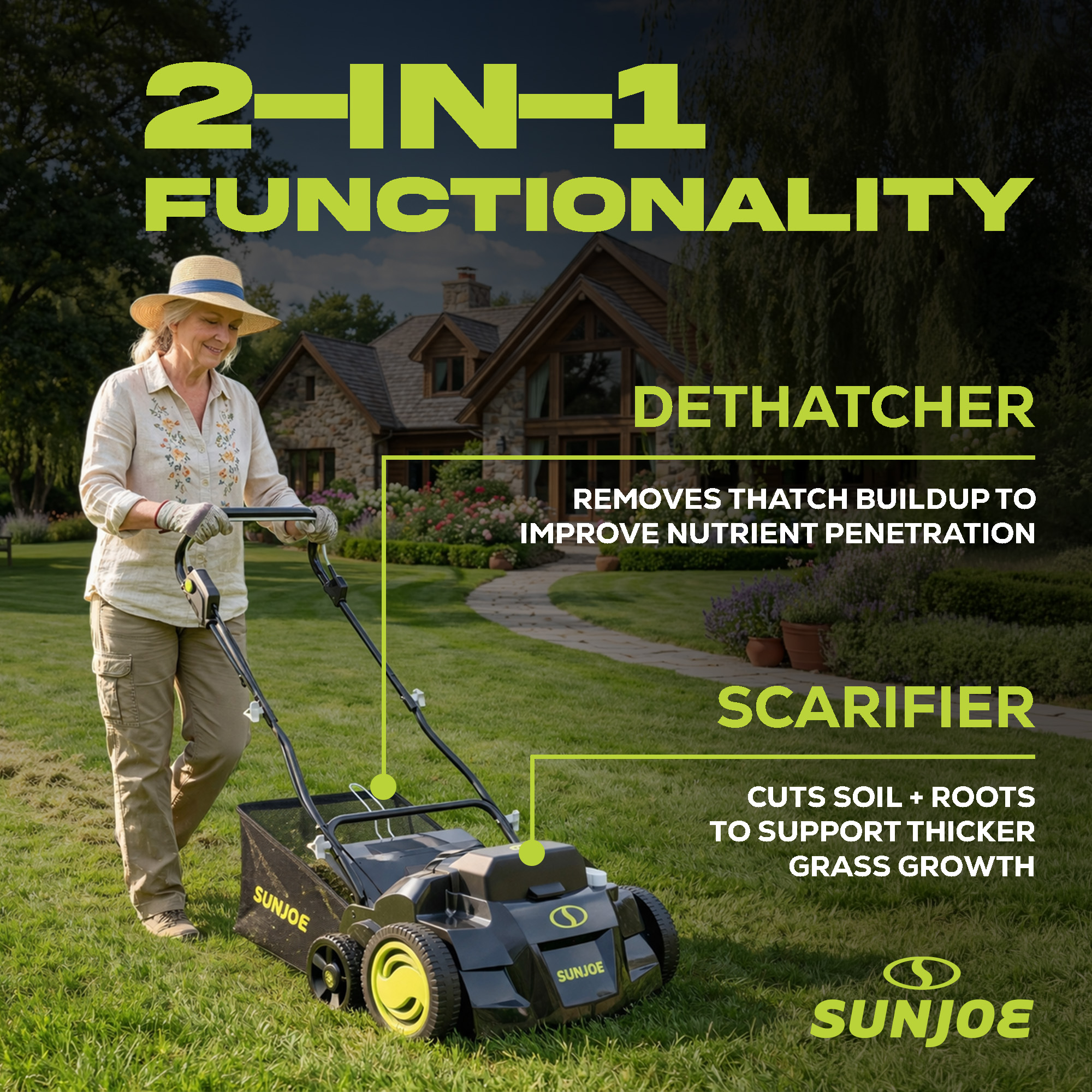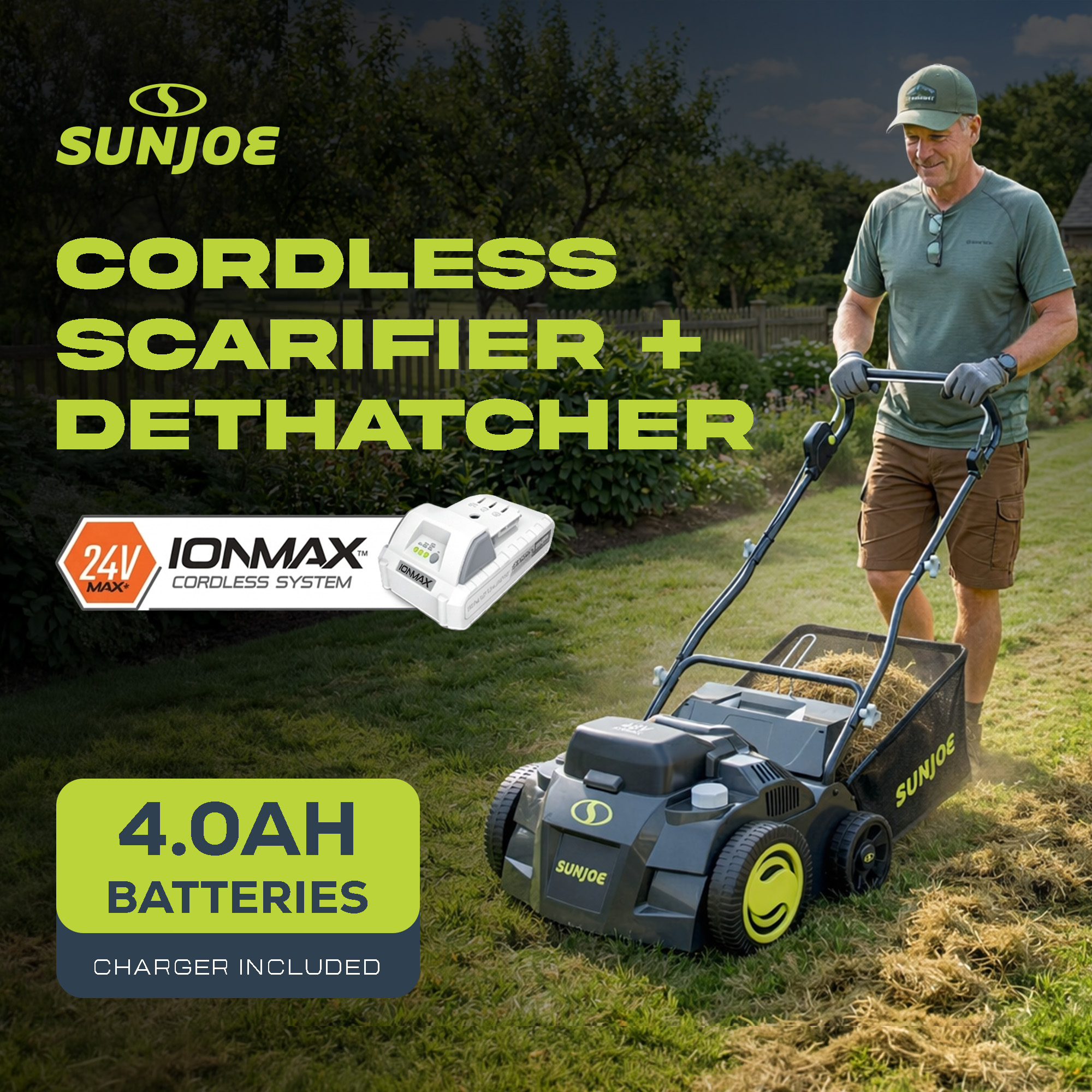 Whether you're preparing your lawn for new seed planting or simply seeking to rejuvenate your outdoor space, the Sun Joe 24V-X2-DTS15 Cordless Scarifier and Dethatcher is the go-to tool for turf experts and homeowners alike. Breathe new life into your lawn and ""Go With Joe"" for a lush, thriving outdoor oasis.