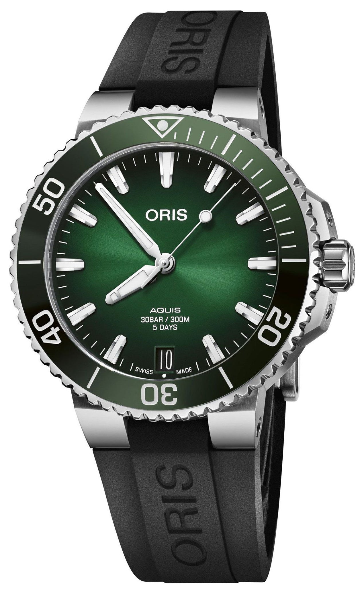 Oris Aquis Automatic Stainless Steel Green Dial Black Rubber Strap Date Divers Mens Watch Model# 400 7769 4157-RS / 01 400 7769 4157-07 4 22 74FC features a 41.5 mm stainless steel case that holds a gorgeous gradient green dial. The stunning dial has silver-tone and luminescent indices as hour markers and matching obelisk-style hands and a date window at the 6 o'clock position. This watch comes with a uni-directional rotating bezel with a green ceramic top ring with minute markings. The black rubber strap has a stainless steel folding clasp with extension and push-button release. This watch runs on an in-house Calibre 400 Swiss automatic movement with a 5-day power reserve and is water-resistant up to 300 meters/1000 feet.