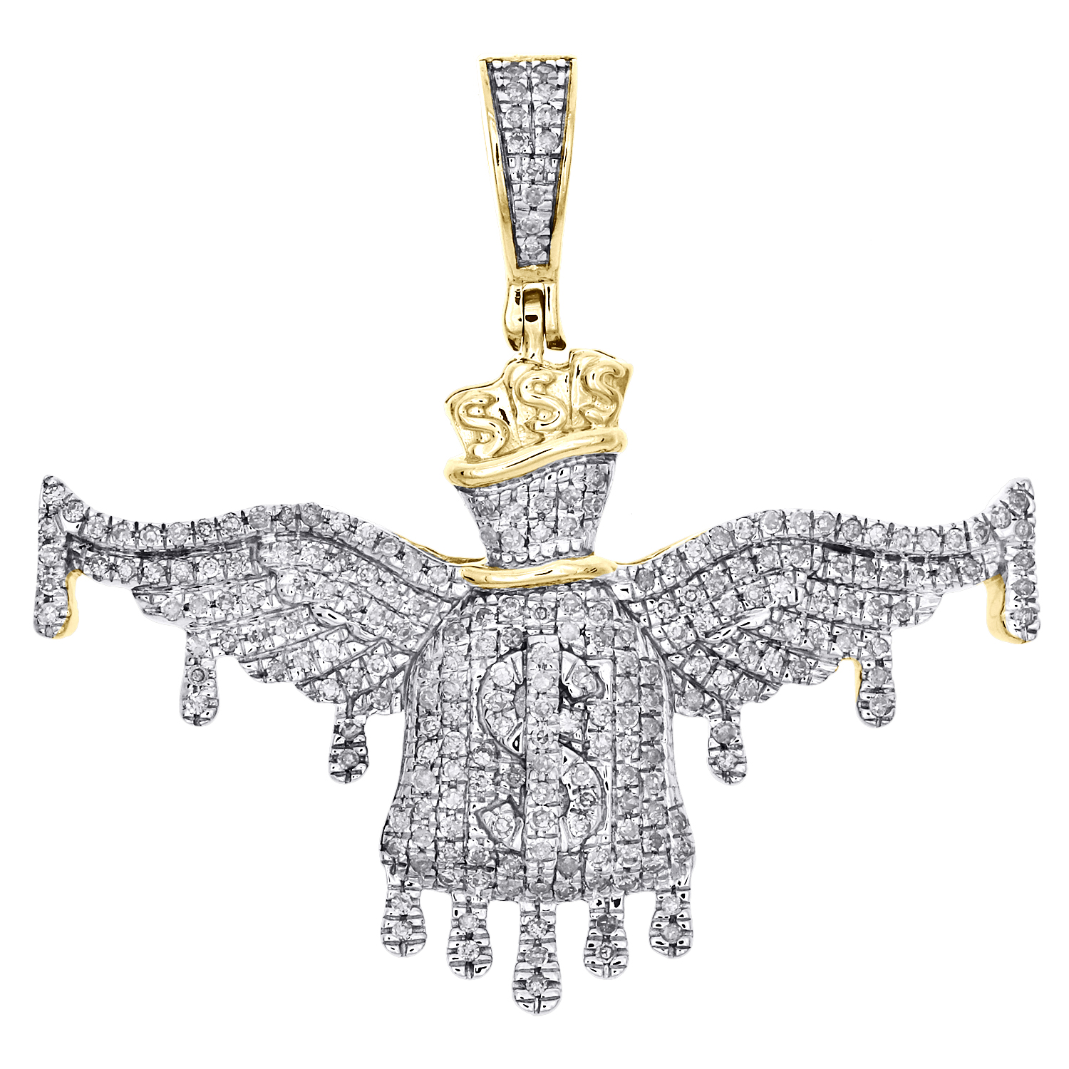 This eye-catching diamond 3D Dollar Sign Money Bag Drip with Angel Wing Pendant is crafted in solid 10K Yellow Gold and shimmering Genuine White Diamond , ensuring sparkle from every angle. Radiant with 1/2 ct. t.w. of genuine diamonds. This pendant is polished to a lustrous shine. Exclusive style has a well built frame, with caged back to withstand everyday wear and tear. The diamonds are securely held between the gold mounting in Pave setting close together, making the overall appearance larger and lustrous. Diamond bail to match the body of this pendant. These are all 100% genuine Round diamonds with matching quality. This pendant measures 1.30" long and weighs 4.7 gr. This one of a kind piece would make a perfect addition to your jewelry collection.