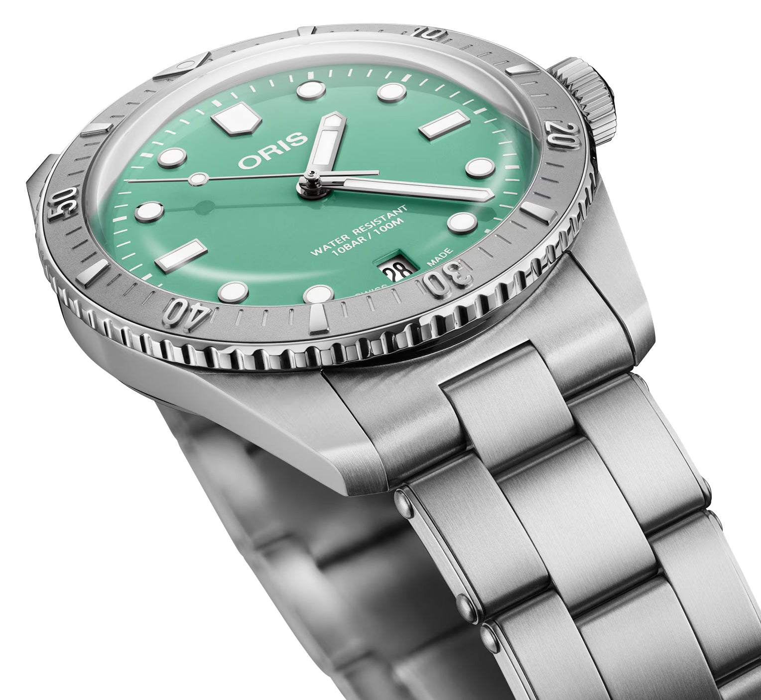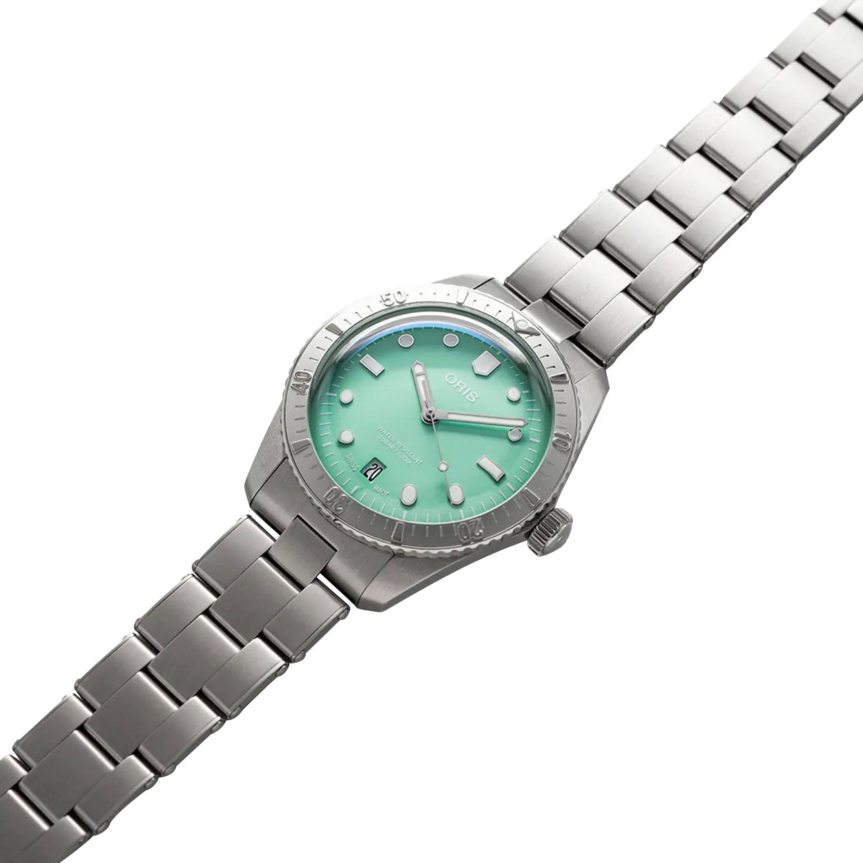 Looking back at Oris's first divers watches released in 1965, the new Divers Sixty-Five, under a vintage aesthetic are engineered using state-of-the-art manufacturing techniques. This new Divers Sixty-Five "Cotton Candy" still has vibrant pastel-hued dials and unisex sizing, but now in stainless steel and an option for dial-matching recycled perlon straps. It features a 38 mm multi-piece stainless steel case that holds a light green dial under a double-domed sapphire crystal. Surrounding it is a stainless steel uni-directional rotating coin edge dive bezel in relief. The dial has silver-tone and luminescent pencil hands with applied dots and indices as hour markers. The fluted crown is situated at the 3 o'clock position while a discreet date window at the 6 o'clock position adds function and symmetry. It is fitted with a stainless steel bracelet on a security folding clasp. Encased within the specially-engraved screw down caseback is the Oris caliber 733-1, a Swiss automatic movement beating at 28,800 vibrations per hour, generating up to 41 hours of power reserve and is water-resistant up to 100 meters/330 feet.
