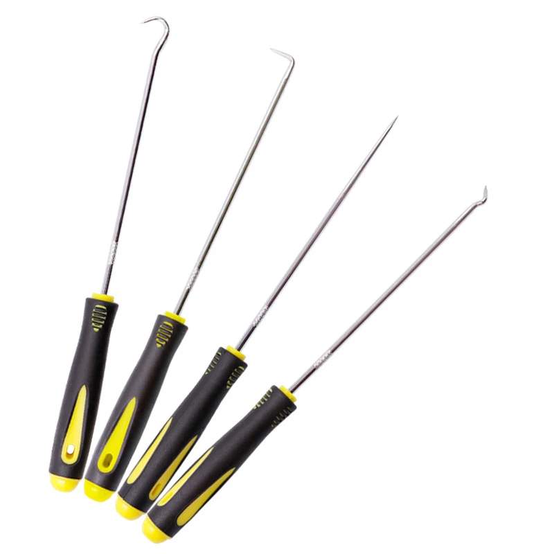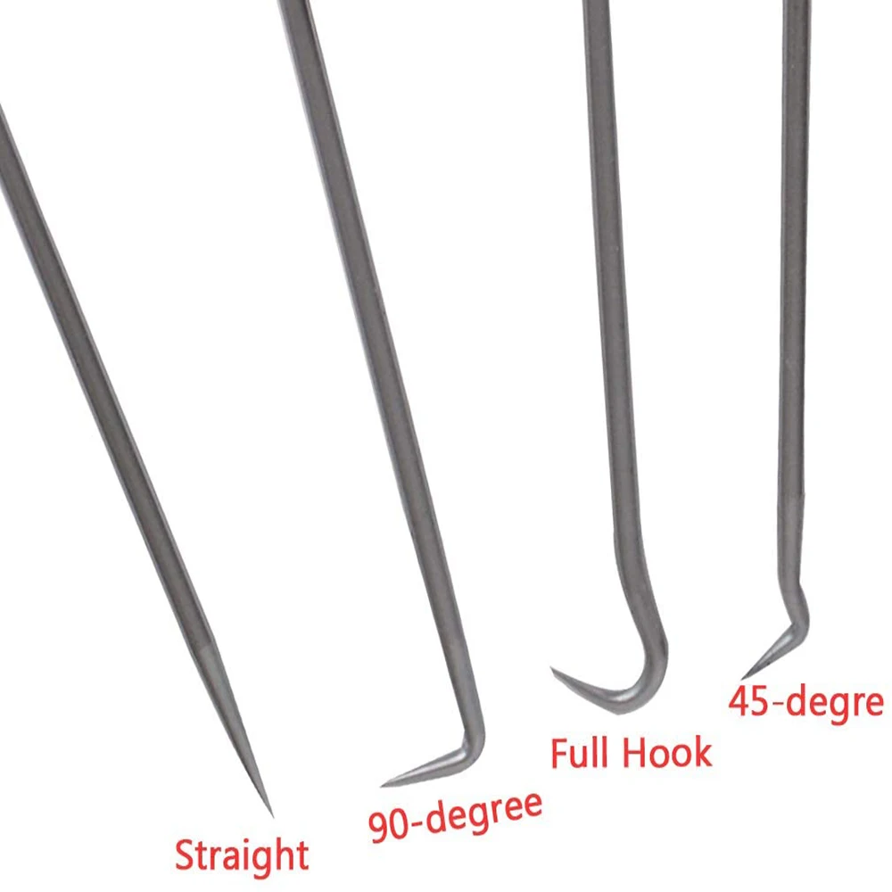 The 4-Piece pick and hook set includes straight pick, full hook, 45 degree hook and 90 degree hook.