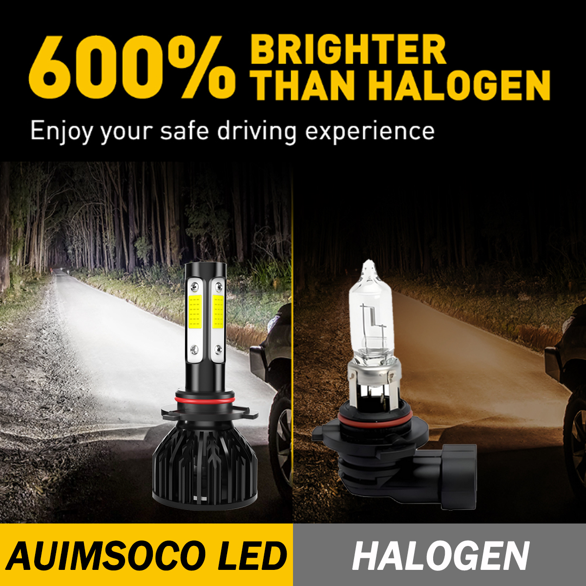 - With 100W and 36000 lumens per LED bulb, AUIMSOCO 4-Sides LED Light Bulbs are boasting 600% increase in brightness compared to traditional halogen bulbs. AUIMSOCO 9005 9006 H11 LED Light Bulbs boast an integrated hollow heat sink and fan that work together to maintain optimal performance.