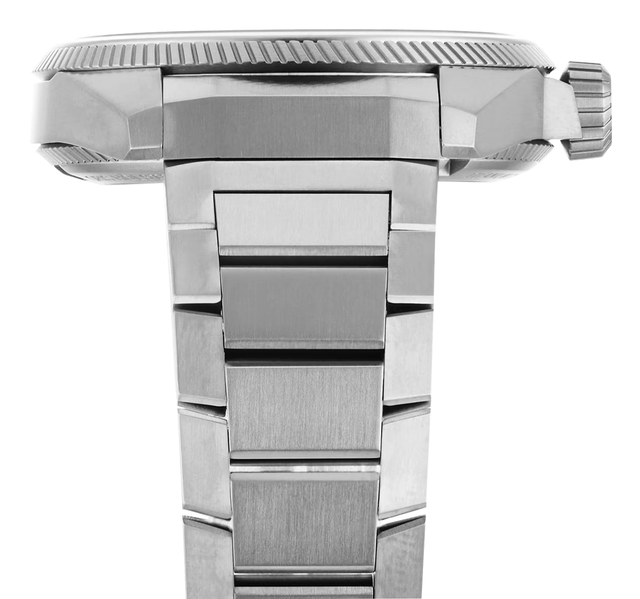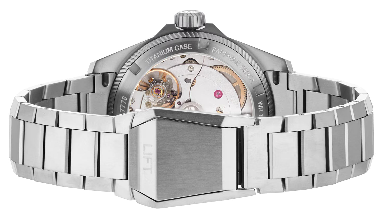 Following from a long line of Oris pilot's watches marching back to the early 1900's, the ProPilot X Calibre 400's power and aesthetics lies beyond its associations. It features a 39 mm multi-piece titanium case that holds a textured smokey blue dial under a double-domed sapphire crystal. It has silver-tone and luminescent obelisk hands and white and luminous stick indices as hour markers. This watch has an angled coin-edge fixed bezel which resembles a jet engine's turbine. Similar design cues are evident on the caseback and protected screw down crown at the 3 o'clock position while a date window sits symmetrically at the 6 o'clock position. Fitted with a sleek and angular multi-piece titanium bracelet on a security folding clasp which interestingly resembles an aircraft seatbelt. Showcased through the exhibition caseback is the in-house produced Oris Calibre 400, a Swiss automatic movement beating at 28,800 vibrations per hour, generating an impressive 120 hours of power reserve, with elevated levels of antimagnetism and is water-resistant up to 100 meters/330 feet.