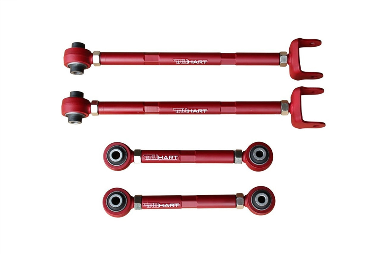 TruHart rear camber and toe arm kit replaces your factory arms with strengthened adjustable arms. This camber and toe kit utilizes hardened rubber bushings which allows for less deflection and provides a more direct feel road feel than OE bushings. Dual locking collars allow for adjustment without removing arm from the vehicle.