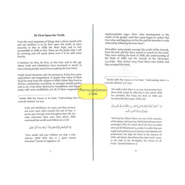 "From the most important things that I advise myself with and my brothers is to be firm upon the truth, to have sincerity in this to Allah, the Most High, and to feel accountable to Allah in this. These are the points that I will be covering and will speak about (even if it be with some swiftness). O brothers, be firm, be firm at this time and in this age where trials and tribulations have increased so much, and in turn, turning people away from accepting the true Islam. People faced situations and circumstances, living lives upon superstition and misguidance. It may be that many of them lived far away from the religion of Allah. Either they lived as Shi'ites, communists, secularists, or amongst socialist parties and so on. From these destructive foundations and slogans, many calls were established, yet all of them evaporated at implementation stage. Their value disintegrated in the minds of the people, such that many began to realize that true value and happiness in this life and the hereafter is only achieved by following the true Islam.