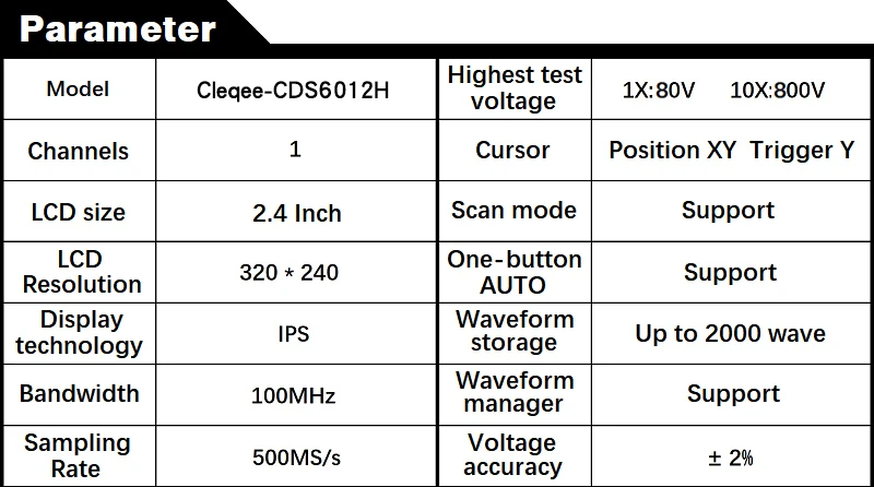 Eigenschaften: 1.Intelligentes Anti-Burn, 1X kann einer Spannung von bis zu 600V standhalten.Afterglow-Display-Technologie. 2,2,4-Zoll-Farbbildschirm mit IPS-Technologie. Mit 100 MHz analoger Bandbreite und 500 MS/s Abtastrate. (1X=5MHz, 10X=100MHz) 3. Wellenformspeicherung mit nur einer Taste. 4.Eingebauter 64 MB Speicherplatz, maximale Speicherung von 2000 Wellenformbildern. 5.Leistungsstarker Wellenform-Dateimanager, Unterstützung für das Durchsuchen, Anzeigen, Anzeigen von Details, Spiegeln, Löschen und andere Funktionen. Hoher Messspannungsbereich, 1X kann 0 bis 80 V messen, 10X kann 0 bis 800 V messen. 6.Bis zu 12 Parametermessungen: VPP, VP, Vmax, Vmin, Vavg, Vrms, Frequenz, Duty, Duty-, Time+, Time-, Time. 7. Die Wellenformanzeige (Pausefunktion) wird jederzeit eingefroren. Ausgestattet mit hocheffizienter Ein-Knopf-Automatik. 8.Komplette Auslösefunktion (einzeln, normal, automatisch). 9.Eingebauter wiederaufladbarer 5000-mAh-Lithium-Akku, vollständig aufgeladen für 12 Stunden Dauerbetrieb. 10.Die Bildschirmhelligkeit kann angepasst werden. 11. Speicherkomprimierungstechnologie, der Wellenform-Aktualisierungsbildschirm flackert nicht. 12.Ultrakleine Größe, leicht zu tragen, mit rutschfester und tropfenfester Silikonhülle.