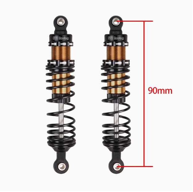 1.Front shock absorber, length about 90mm (hole center distance), compression stroke about 26MM.Rear shock absorber, length about 100mm, (hole center distance), compression stroke about 30MM