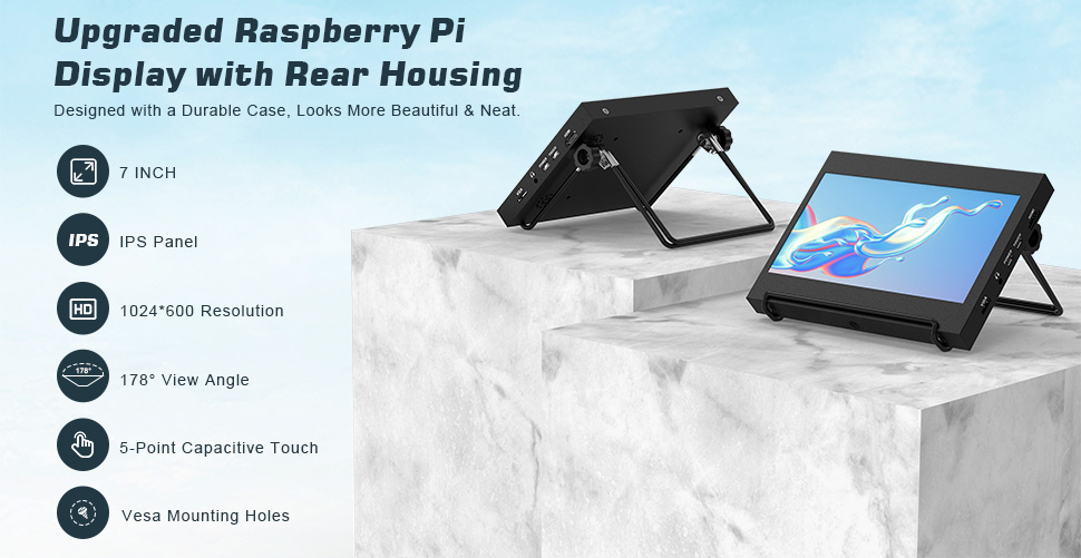 Bedeckt mit SchutzfallUnterscheidet der nackte Bildschirm, dieser Himbeer -PI -Monitor, der mit einem dauerhaften Gehäuse außerhalb des Displays bedeckt ist. Sieht ordentlich und schöner aus. |