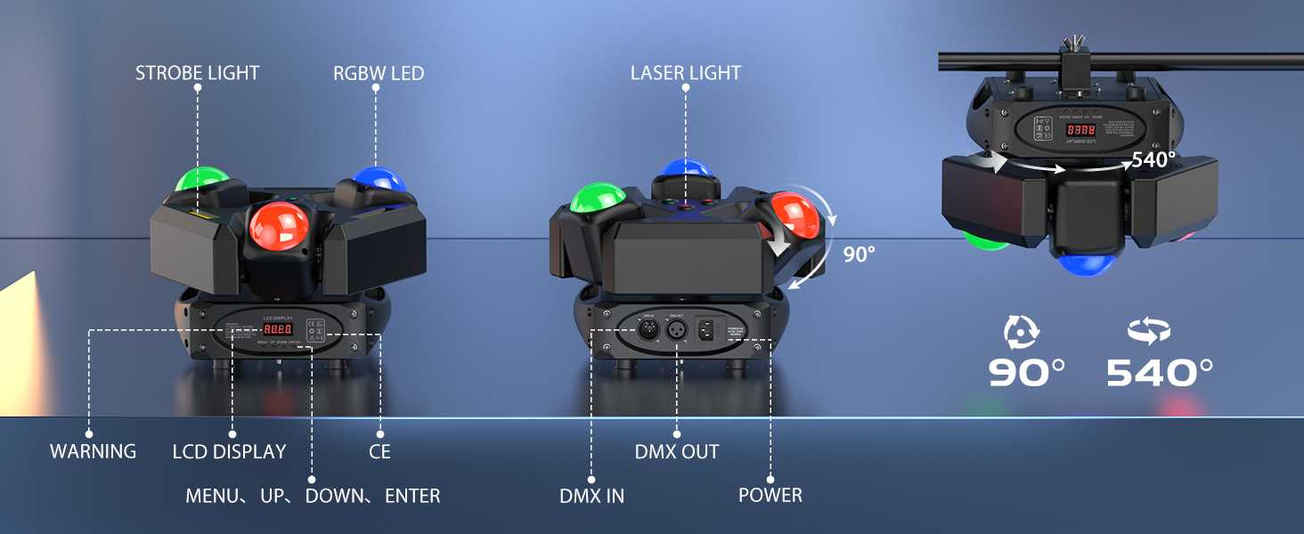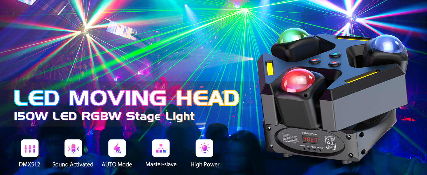 This moving head light features three heads with 9 LED beams, a full sky effect with 2 red and 1 green laser, and COB amber yellow strobe effects.