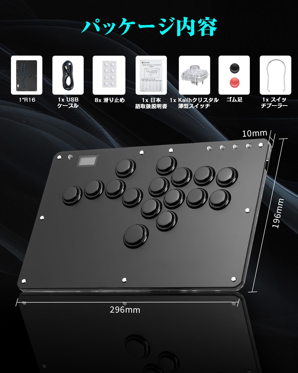 Easy-to-use size for lap play! R16 Fighting Game Controller (16 buttons), USB cable, switch puller, six anti-slip pads, and a Japanese instruction manual.