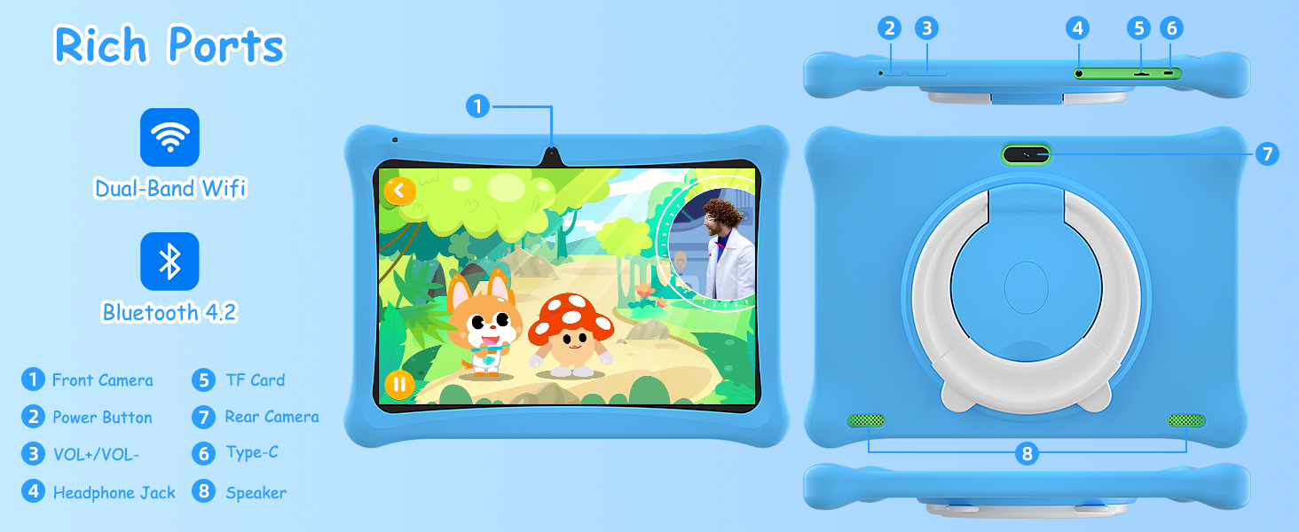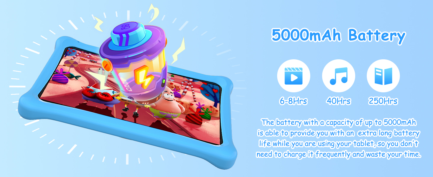 - 【Large battery capacity】 The 6000mAh battery and low-power CPU enhance your experience and allows you to enjoy up to 6-8 hours of reading, watching shows, surfing the web. The tablets for kids suitable for long-distance flights or road trips. Wonderful companion to your tablet kids for playing and learning.