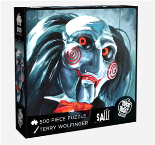 A creepy 500-piece jigsaw puzzle featuring Billy the Puppet from the SAW movies, illustrated by master artist Terry Wolfinger! Collect them all!