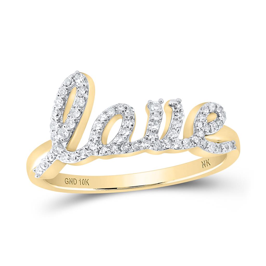This exquisite diamond Love Band Ring, casted in 10k Yellow Gold. Radiant with 0.25 ct. t.w. of Round cut diamonds and high polished to a bright lustrous shine. This statement ring will sparkle for a lifetime, a look she'll always treasure. Diamonds are Prong set in-between the Yellow Gold mounting to securely fasten the diamonds. The diamonds are hand set precisely to give it a smooth uniform flow. Solid mounting, the ring weighs approx. 2.28 gr. All diamonds in this ring are matching in clarity and color. Currently this ring is ladies size 7, if you would like this ring in a different size please message us, for resizing charges and we will get back to you right away. This ring can be sized at your local jeweler as well.