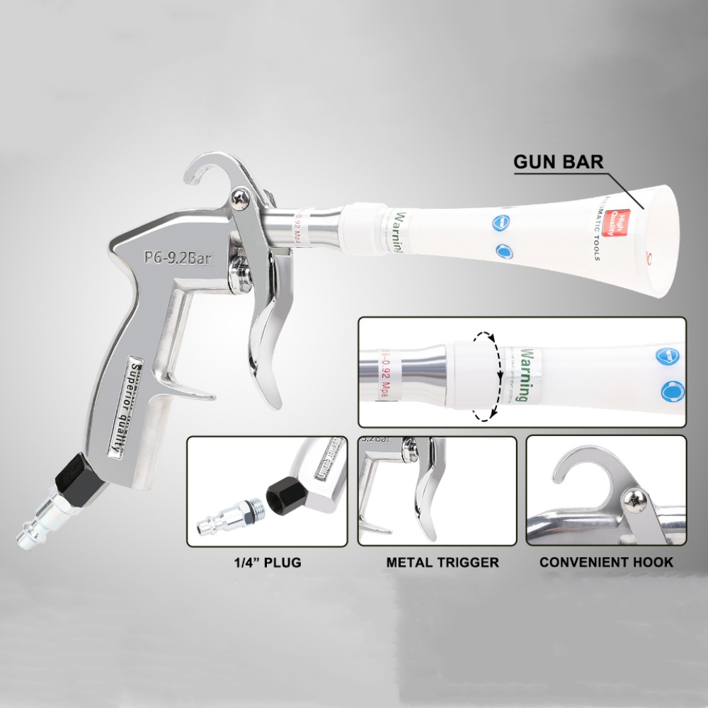 【High Quality】Aluminum alloy gun bar with brass and sprayer nozzle,a more Long-lasting and efficient car duster interior and exterior surface/detail cleaning.Equipped with 360-degree high-speed swivel to ensure maximum coverage and efficiency, reaching all hard-to-reach areas.The key connectors and ball valves are made of copper, and the extraordinary quality you deserve.You can choose our products with confidence!