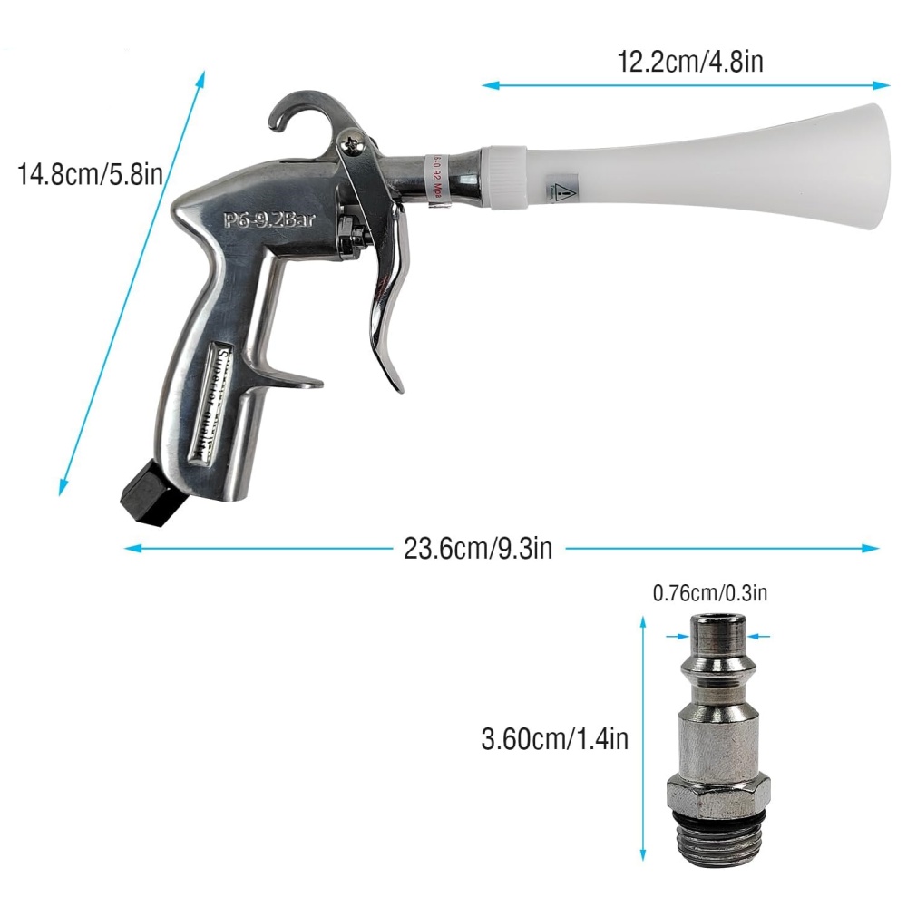 【Easy To Use】High car pressure cleaning tool needs to be used with an air compressor. Make sure air inlet adapter is sized for 1/4 IN. Connect adapter to air compressor and check pressure is in range of 6-9.2 bar/80-160 PSl. Keep air gun blower 1-10 cm away from objects to be cleaned. Stay away from children and do not point it at people when in use.