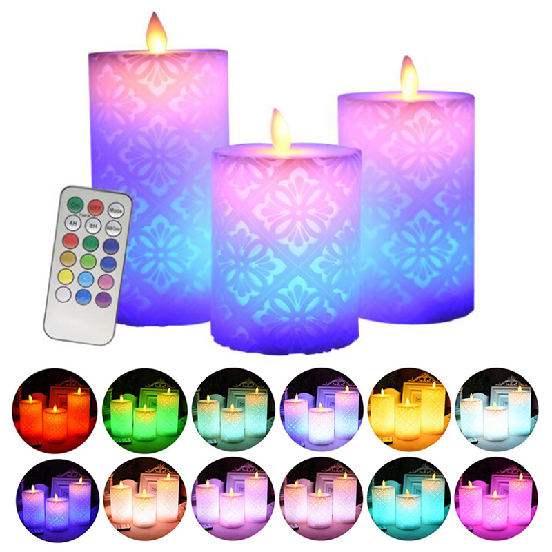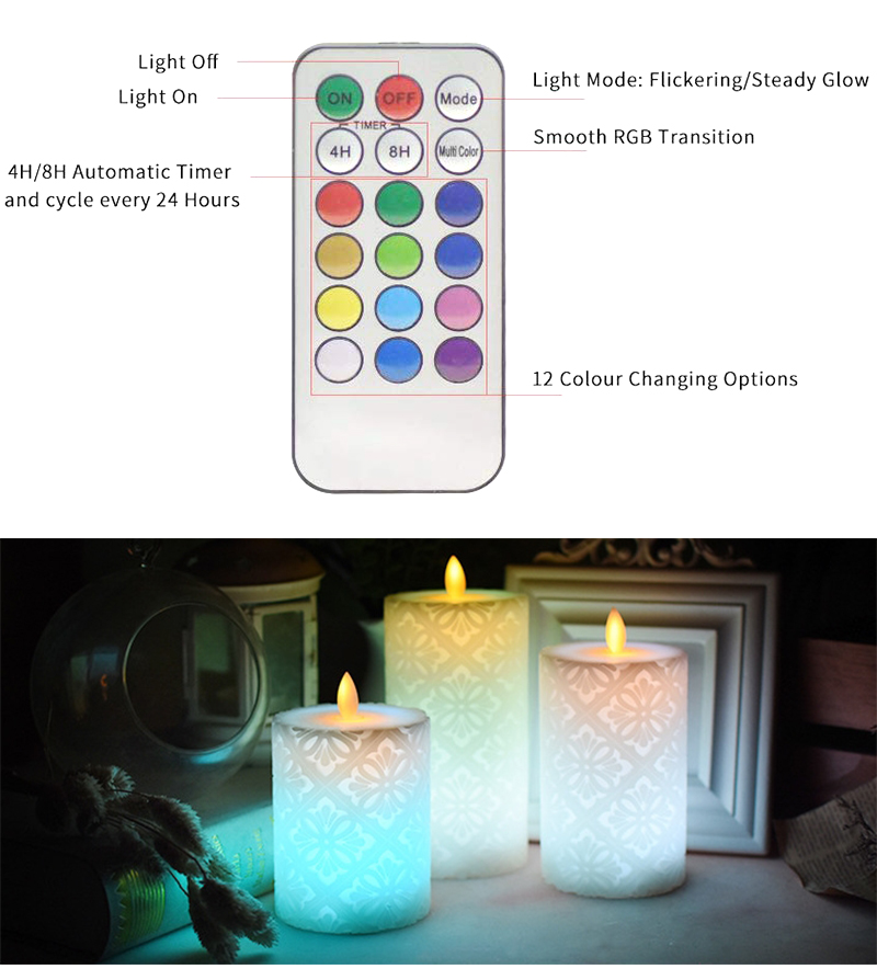 Description: brand new and high quality Feature: The shell is made of high-quality wax material, smokeless and safe; engraved with floral printed pattern design, beautiful and generous. The inner candle adopts LED light beads, has a long service life, energy-saving and environmentally-friendly. Battery installation design on the bottom makes it more convenient for us to use, practical and useful. The swing beads simulates the real candle wick, soft light creates the natural romantic atmosphere. Multi-color switching, suitable for home decoration, club, Christmas day, church, coffee shop, wedding, hotel, etc. It can be used in many occasions, including Christmas Day, birthday party, Thanksgiving Day, wedding ceremony, Valentine's Day, Mother's day, Father's Day, Easter and Halloween, etc.