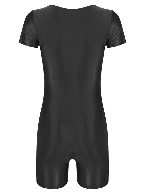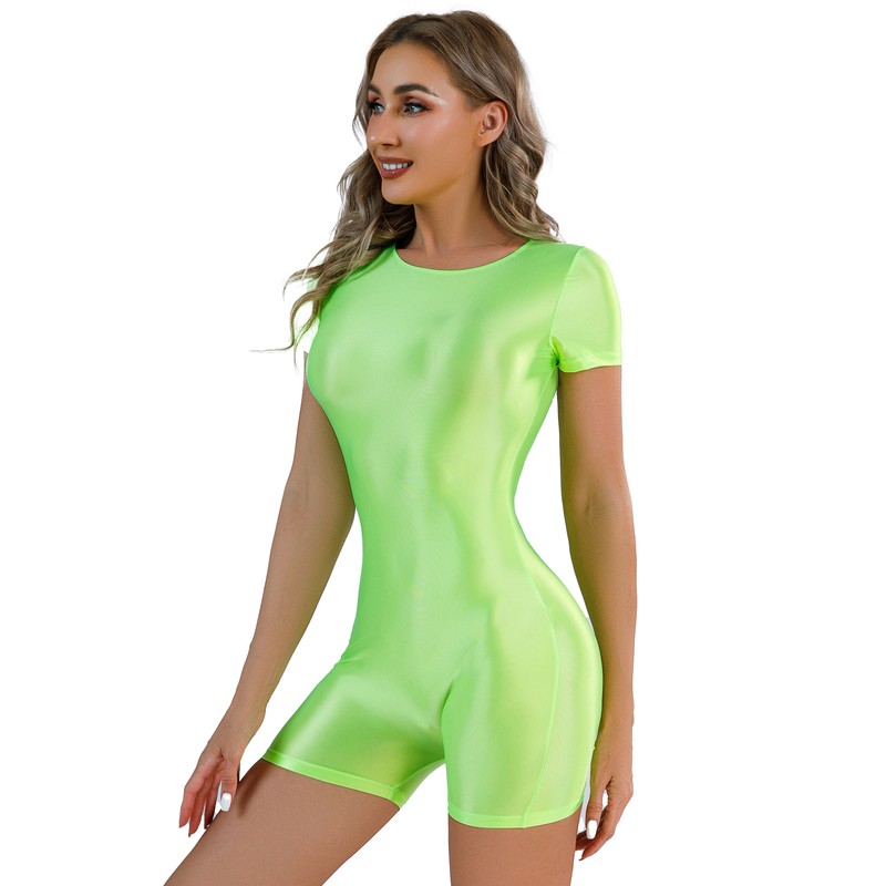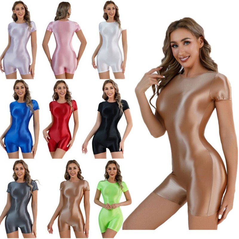 Womens Glossy Short Sleeve Round Neck Bodysuit Swimwear for Sport Yoga.