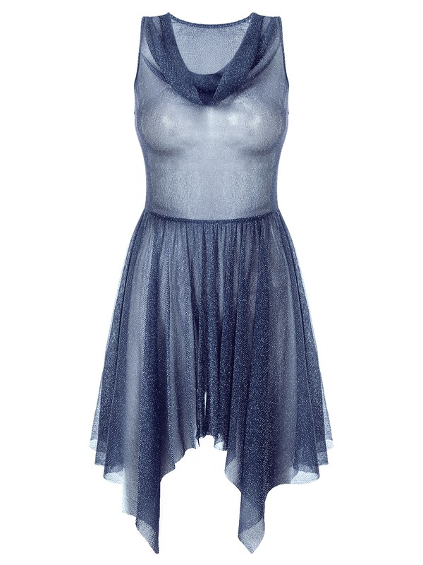 Sleeveless dance dress for women, see-through design, draped neck and asymmetrical hem adds fashion element.