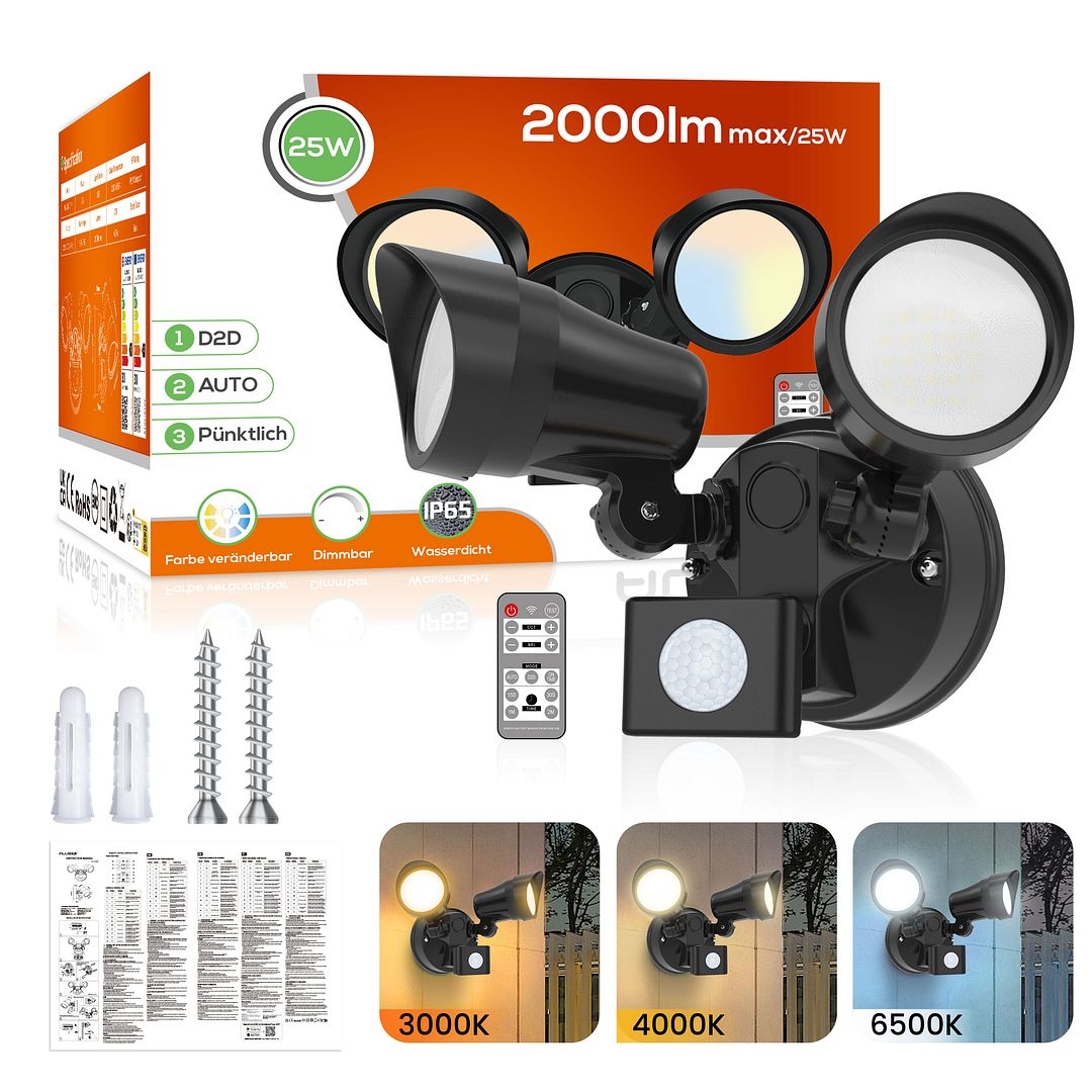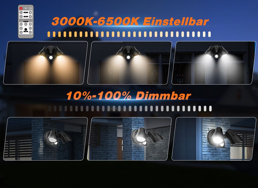 3-IN-1: PIR Motion Sensor und On Time Modus: Diese Outdoor-Sicherheitsleuchte mit Funktion des PIR-Bewegungserfassungsmodus und des Zeitmodus. Der PIR-Modus mit 4-Delay-Einstellungen (15s/30s/1min/2min), 2-Sensormodi (DAY/NIGHT). Perfekt für Garten, Hinterhof, Garage, Türen. Sie können es auch auf den On-Time-Modus einstellen und per Remote-Ein/Aus-Taste steuern, was eine gute Wahl für die Beleuchtung Ihres Gartens für Outdoor-Partys ab 24H ist.Dreifarbig & dimmbar : Angenommenes neues Design, Sicherheitslicht kann auf 3000K (Warmweiß) oder 4000K (natürliches Weiß) oder 6500K (kühles Weiß) eingestellt werden, um Ihren Bedarf zu erfüllen. Es kann auch von 10% bis 100% Helligkeit gedimmt werden. Verglichen mit den herkömmlichen Sicherheitsleuchten auf dem Markt, kann es effektiv Ihre unterschiedlichen Bedürfnisse erfüllen.