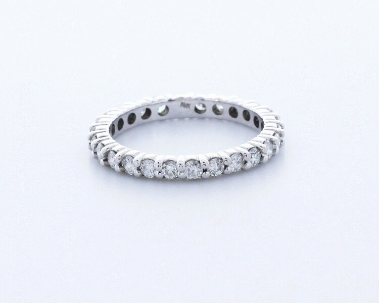 A strikingly sophisticated 2.11 carat total 18k white gold classic eternity ring with round brilliant cut diamonds certified by AGI Gemological Laboratories as Natural Earth Mined Diamonds with G color, VS2 clarity, and with Very Good cut and proportions. To emphasize the true brilliance of the diamond on this costume piece our jewelry designer used 4-prong setting. The certificate report accompanied with this item states the characteristics of the diamond and with estimate appraised value of $5,843.