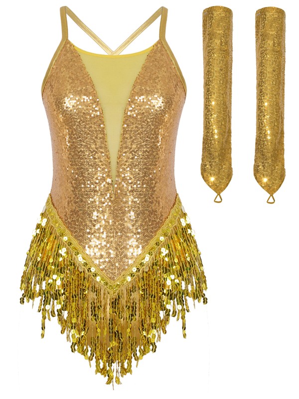 Womens Sparkling Sequins Fringed Leotard Cross Back Bodysuit with Sequin Long Gloves.