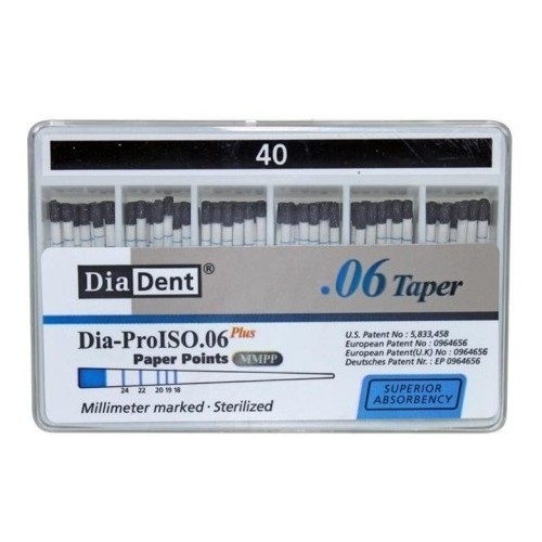 Dia-ProISO GT Paper Points – 0.06 Taper, 100/Pkg, Size 40. These points are highly absorbent and are uniformly tapered to match .06 tapered instruments. Points are millimeter-marked to provide preliminary guidance in measuring the root canal depth before proceeding clinically with the application of gutta percha points