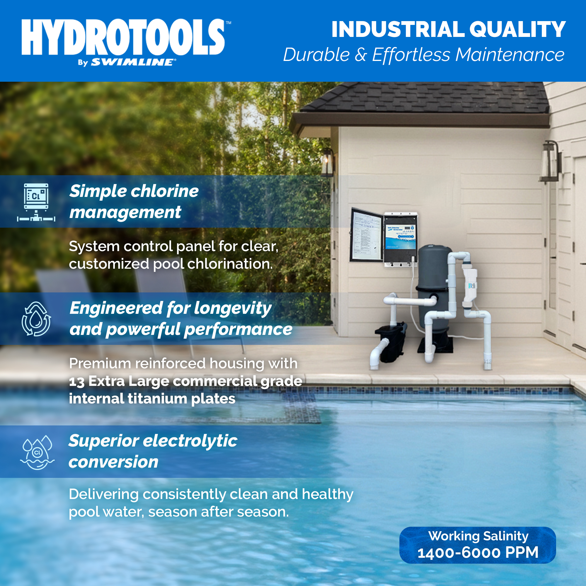 The Salt Chlorine Generation series was designed to completely revolutionize the way you approach cleaning your pool. Its structure was designed strategically so it can serve as a drop-in replacement without requiring major plumbing alterations when replacing an old system - the chlorinator works automatically with your existing pump. Constructed with commercial grade, double-reinforced thermoplastic, these cells were built to tackle all the elements, sporting UV and corrosion resistance. Innovative reverse polarity self-cleaning systems constantly work in the background to ensure superior strength, durability, and increase longevity. Installing a Hydrotools Salt Chlorine Generator is an investment both in your health, reducing skin, hair, and eye irritation, and also your wallet in the long term - cost savings can amount up to 50% in contrast with traditional chlorination applications. Utilize Hydrotools Salt Chlorinators for crystal clear, silky-smooth, gentle water so you can enjoy more time in the pool with friends and family.