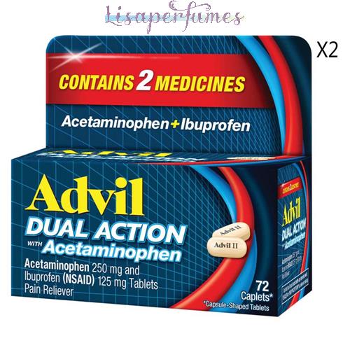 |  | | Brand | Advil | | Name | Dual Action With Acetaminophen Pain Reliever | | Gender | N/A | | Type | Pain Reliever | | Size | 2 Packs | | Packaging | New In Box |