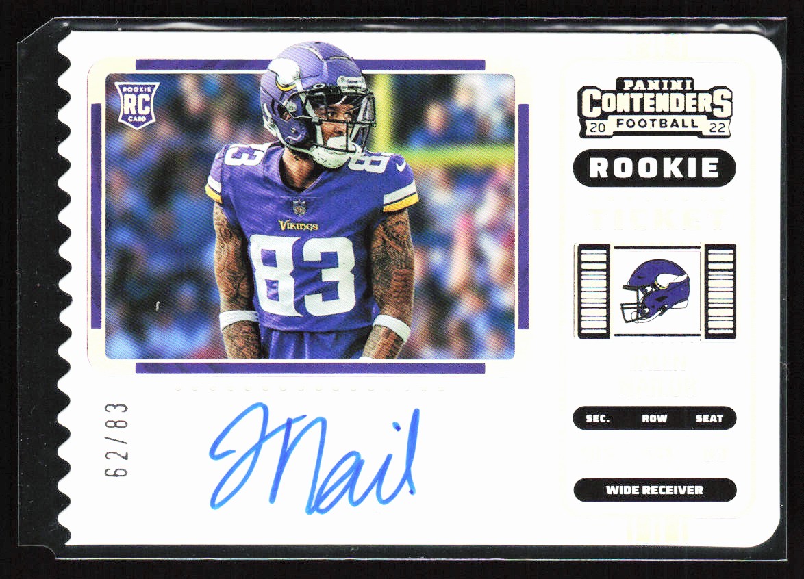 | Description: | Jalen Nailor | | Category: | Football | | Year: | 2022 | | Product: | Panini Contenders Rookie Ticket Stub Variation | | Team: | Minnesota Vikings | | Hand Signed: | Yes | | Rookies : | Yes | | Serial Number: | 62/83 | | Dimensions: | 3¾" x 2¾" | | SKU: | MID |