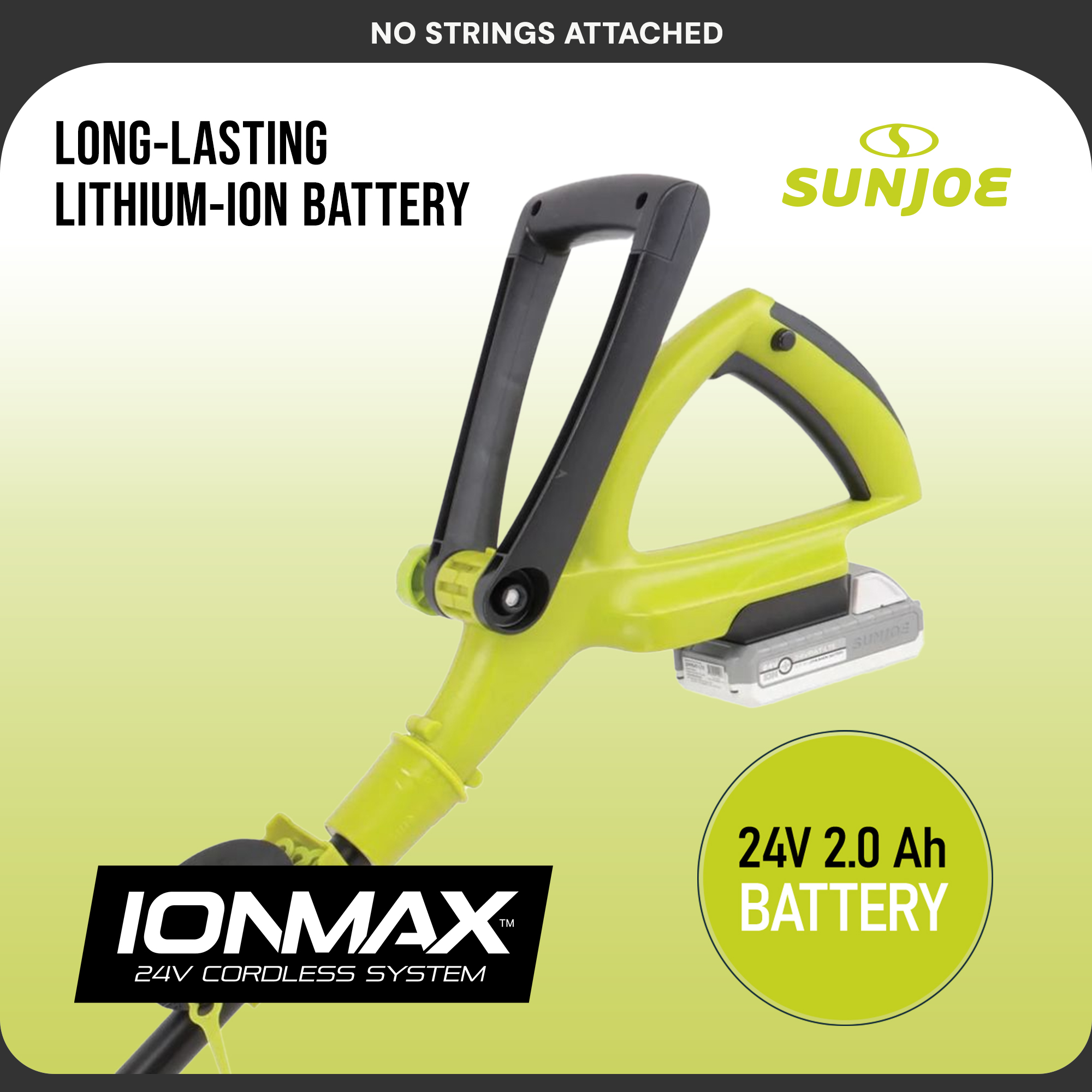 NO STRINGS ATTACHED. Say goodbye to tangled strings and extension cords with the next generation of grass-trimming tech: 24V-SB10 24-Volt* Trimmer Edger from SUN JOE. Powered by SUN JOE’s exclusive, eco-friendly IONMAX lithium-ion battery system, 24V-SB10 provides reliable, rechargeable no-fade power performance.