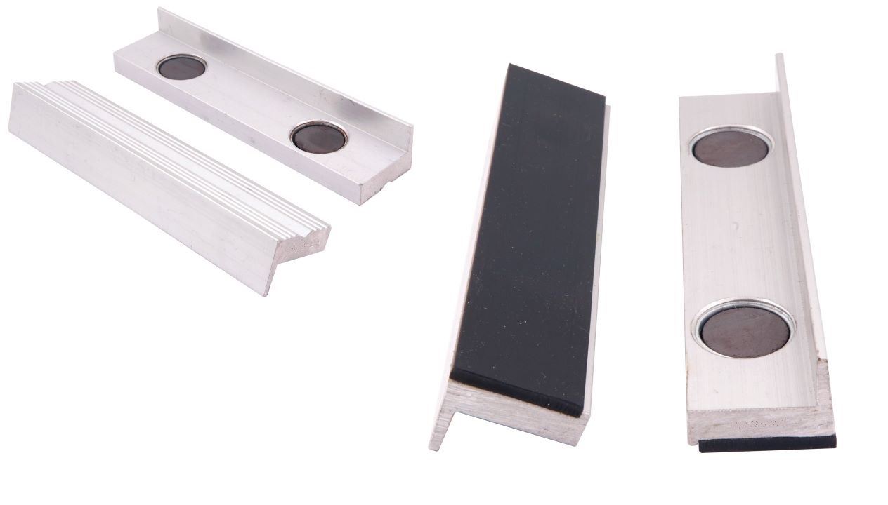 The 5 x 1-1/8" aluminum soft vise jaws with magnets are constructed from a hardened aluminum alloy with two built-in circular permanent magnets on the backside which holds the workpiece securely to the vise.