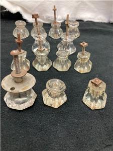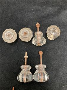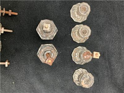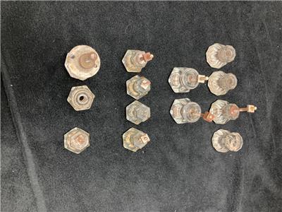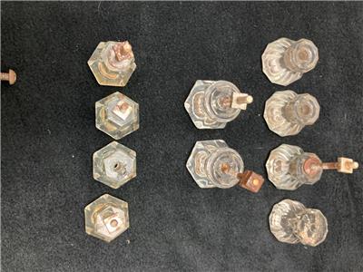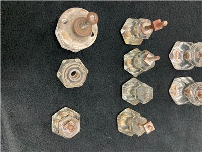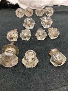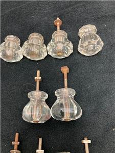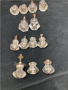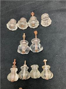 You are bidding on a Lot Of 13 Antique Glass Drawer Pulls. There are a Variety of Sizes & Styles. Some have the hardware and some do not. There a 4 pieces that are about 1.25" wide and about 1.5" tall. On of the 4 has the screw. There are 2 larger pulls both with screws that are Hexagon shape and 1.75" across and 1 3/8" tall. There are 4 smaller pulls that are about 1" wide and 1.25" Tall and 3 have the screws. Then there are 3 assorted pieces 0f which 2 have screws. The big one has metal base and is 1.5" wide and 1.25" tall.