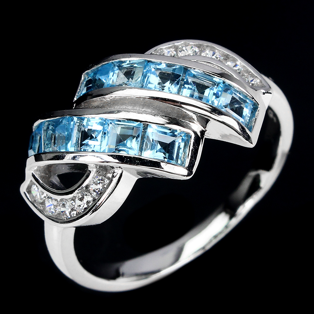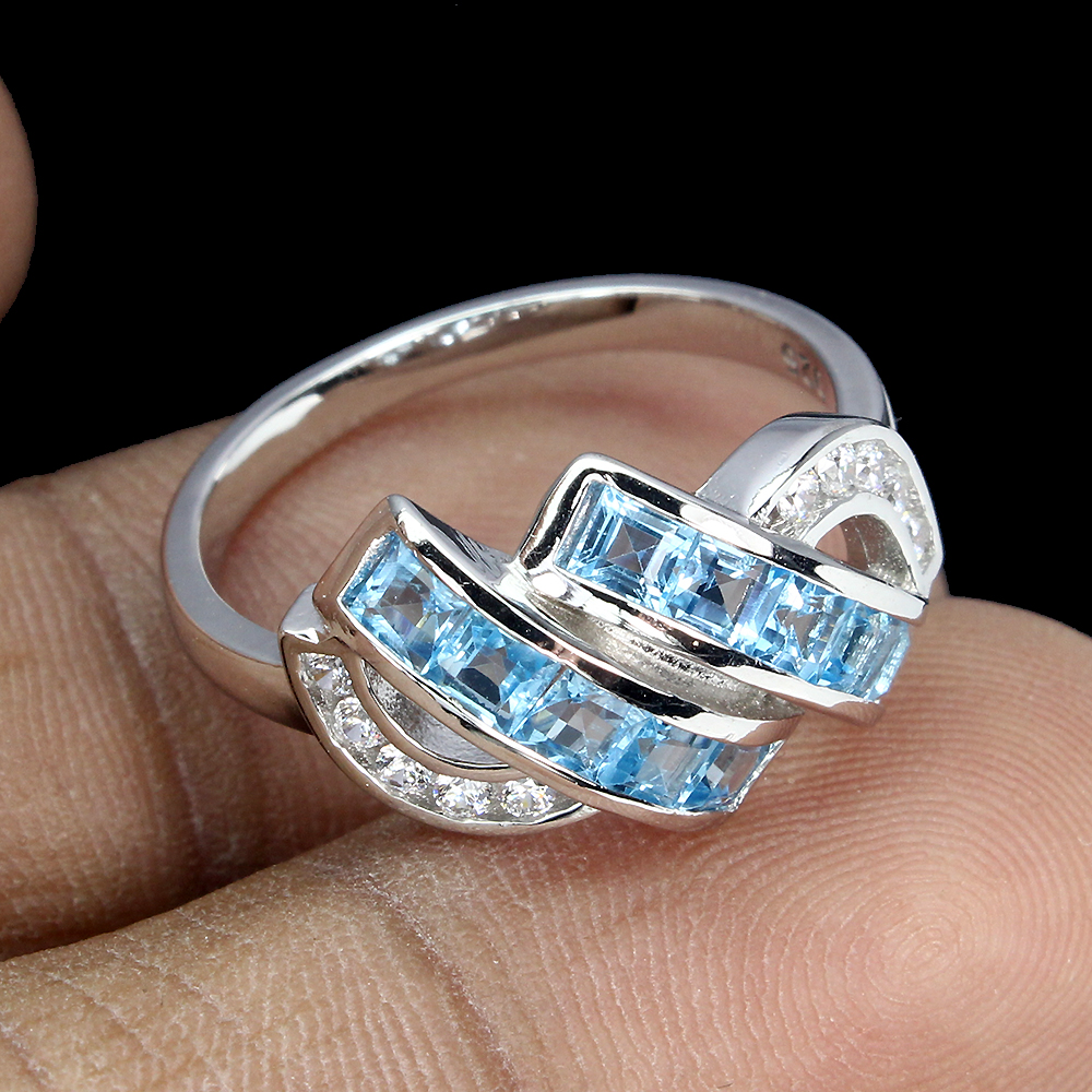 Square Swiss Blue Topaz 3mm Cz 14K White Gold Plate 925 Sterling Silver Ring 7.5