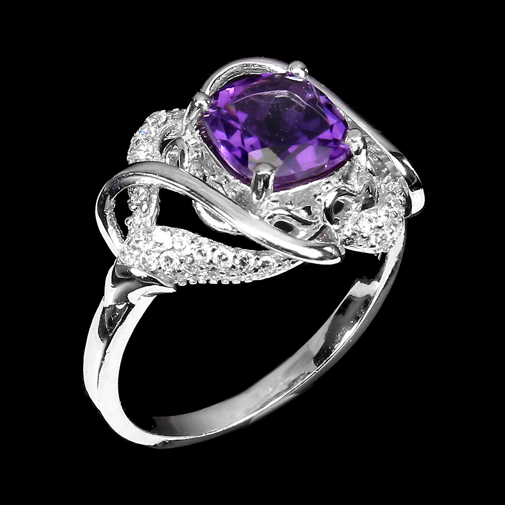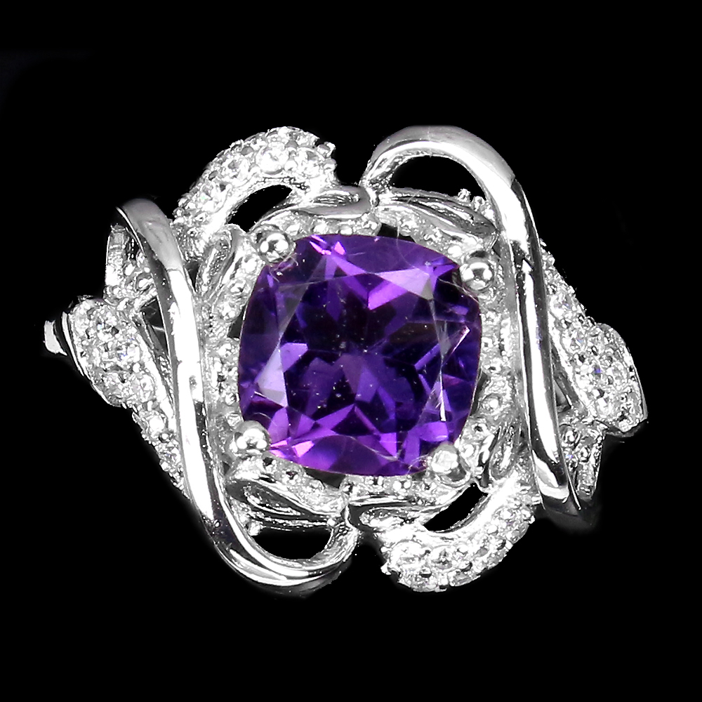 Unheated Cushion Amethyst 7mm Cz 14K White Gold Plate 925 Sterling Silver Ring 7