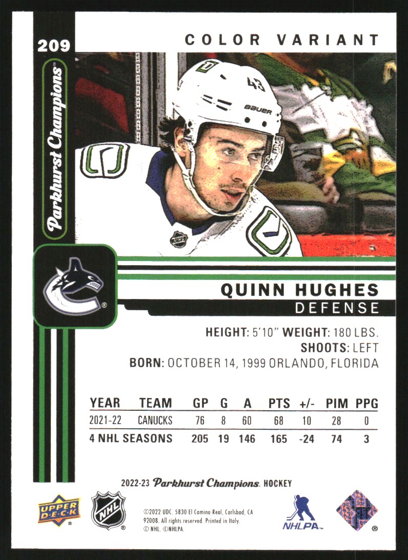 2022-23 Parkhurst Champions Color Variation #209 Quinn Hughes - HKY
