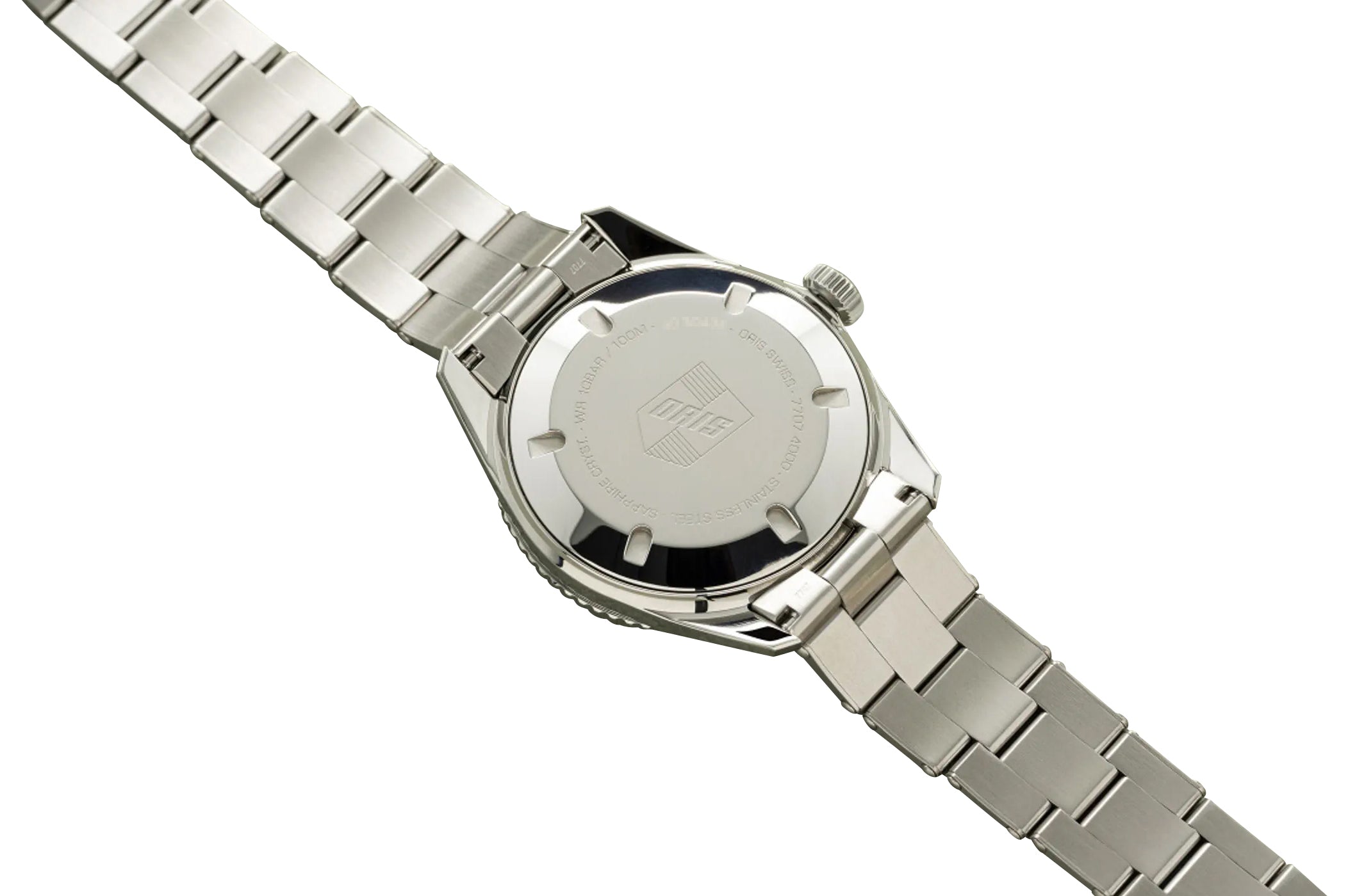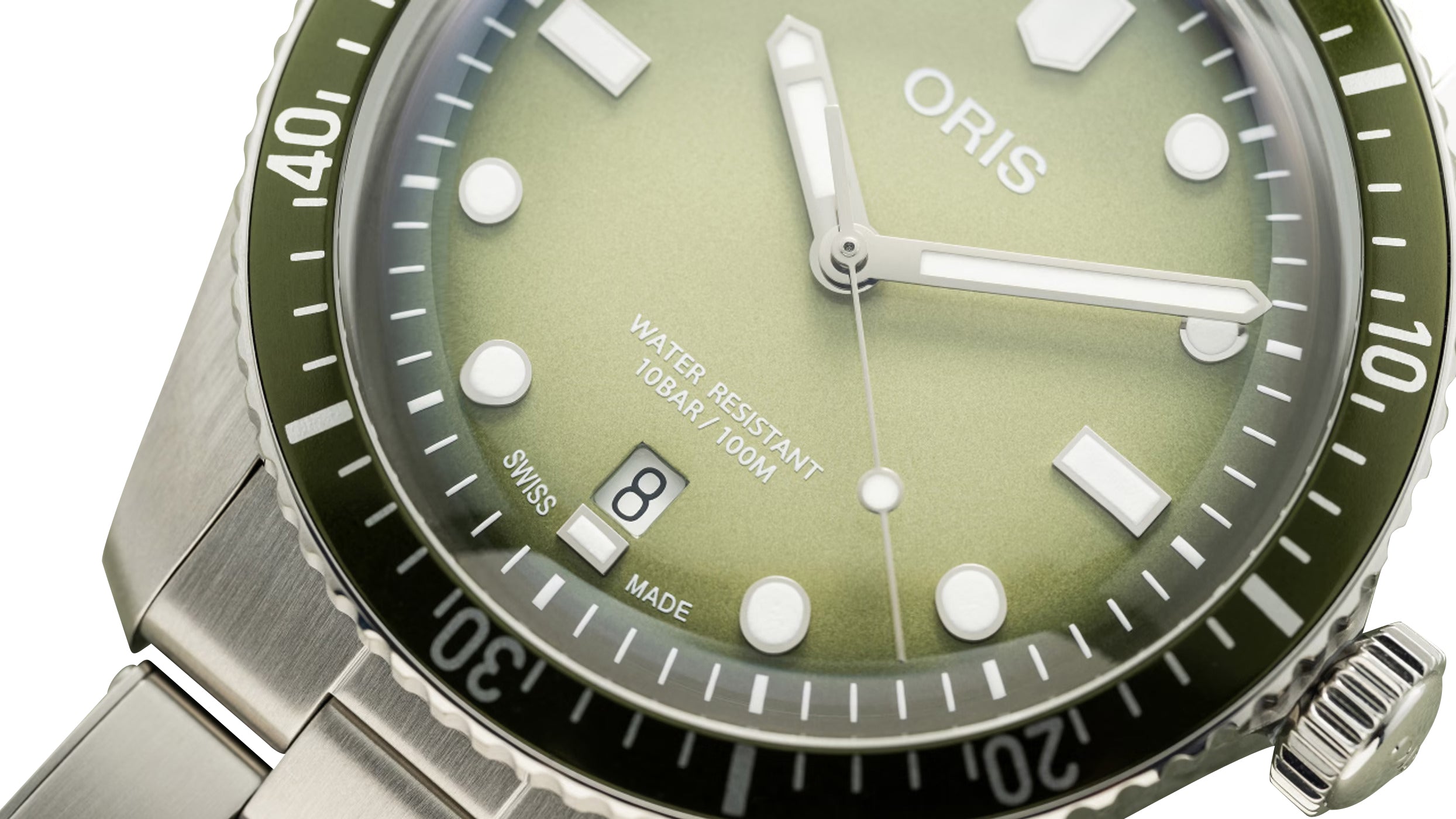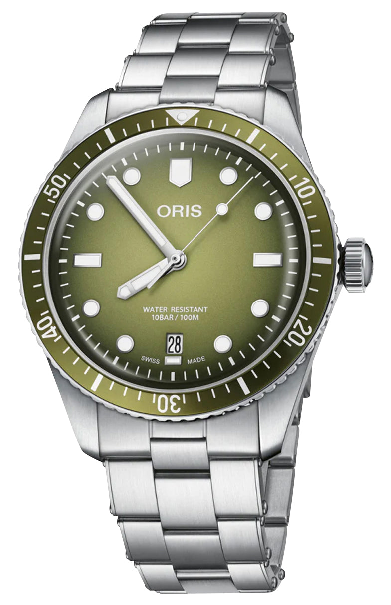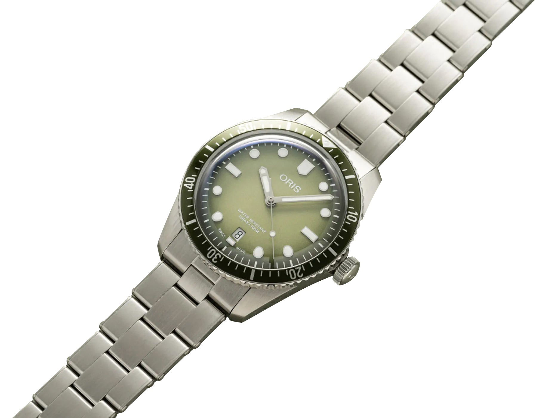 Looking back at Oris's first divers watches released in 1965, the new Divers Sixty-Five, under a vintage aesthetic, are engineered using state-of-the-art manufacturing techniques. This Oris Divers Sixty-Five features a 40 mm multi-piece stainless steel case that holds a graduated green dial, capturing the tones that define the forests of the Waldenburg Valley under a double-domed sapphire crystal. Surrounding it is a uni-directional rotating coin edge dive bezel with a luminous bezel marker on a matching green top ring. The dial has silver-tone and luminescent pencil hands with applied dots, rectangular indices, and a pentagonal index at the 12 o'clock position as hour markers. The fluted screw down crown is situated at the 3 o'clock position while a discreet date window at the 6 o'clock position adds function and symmetry. It is fitted with a stainless steel bracelet on a security folding clasp. Encased within the specially-engraved solid caseback is the Oris caliber 733-1, a Swiss automatic movement beating at 28,800 vibrations per hour, generating up to 41 hours of power reserve, and is water-resistant up to 100 meters/330 feet.