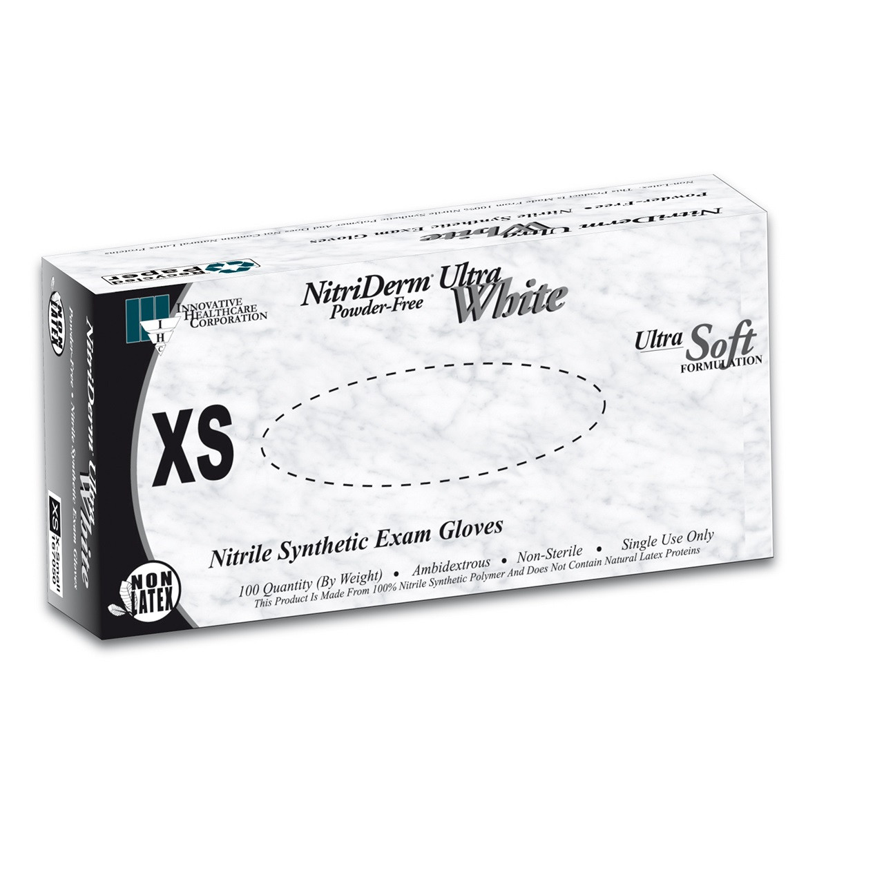 Nitriderm Ultra White PF XS 100/Bx. Exceptionally soft, thin-film, low modulus nitrile synthetic is very comfortable for extended periods. Very good donning properties. Slightly tacky, textured fingers provide excellent gripping properties.