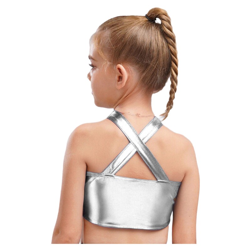 Girl’s sleeveless metallic crop top with keyhole and cross design looks stylish and chic.