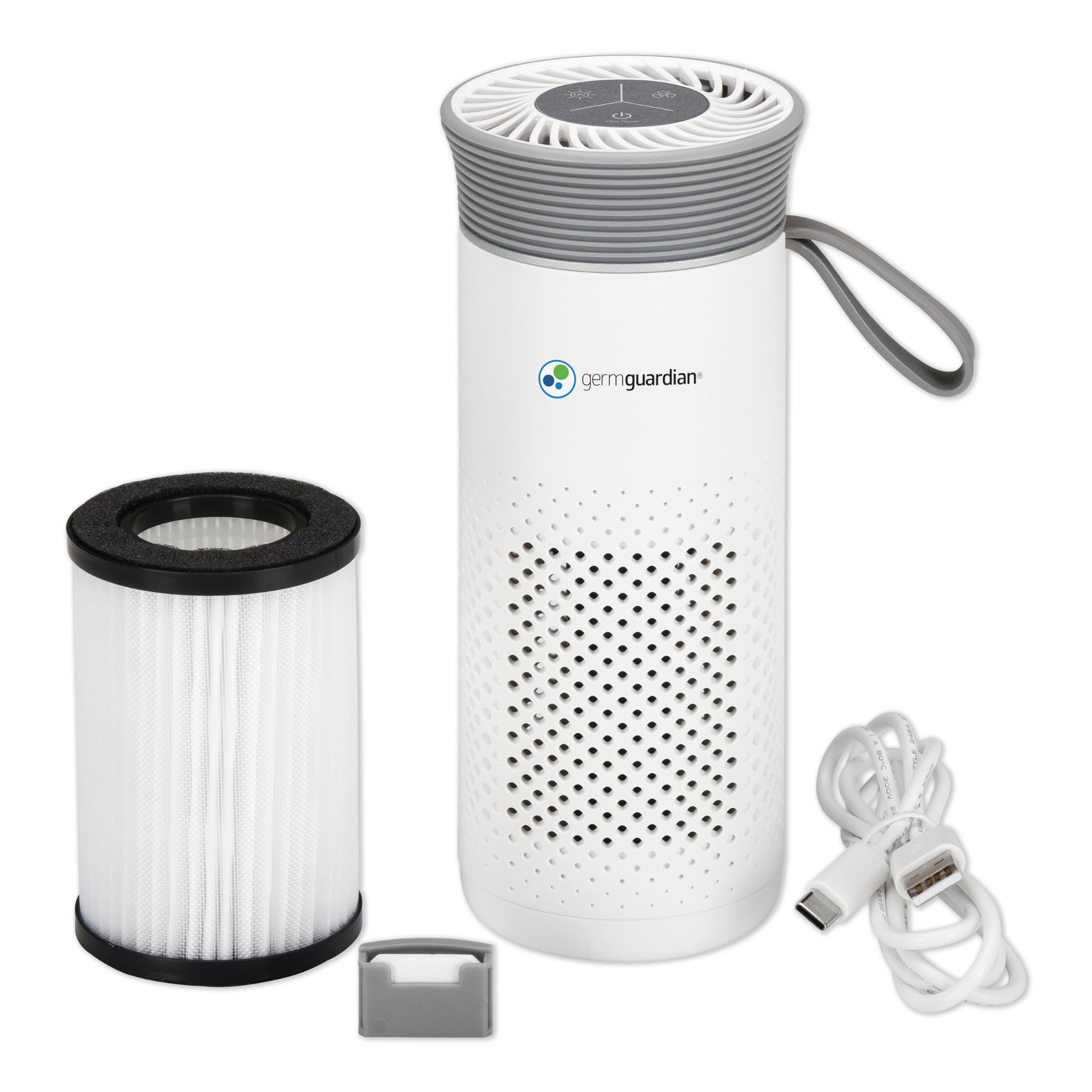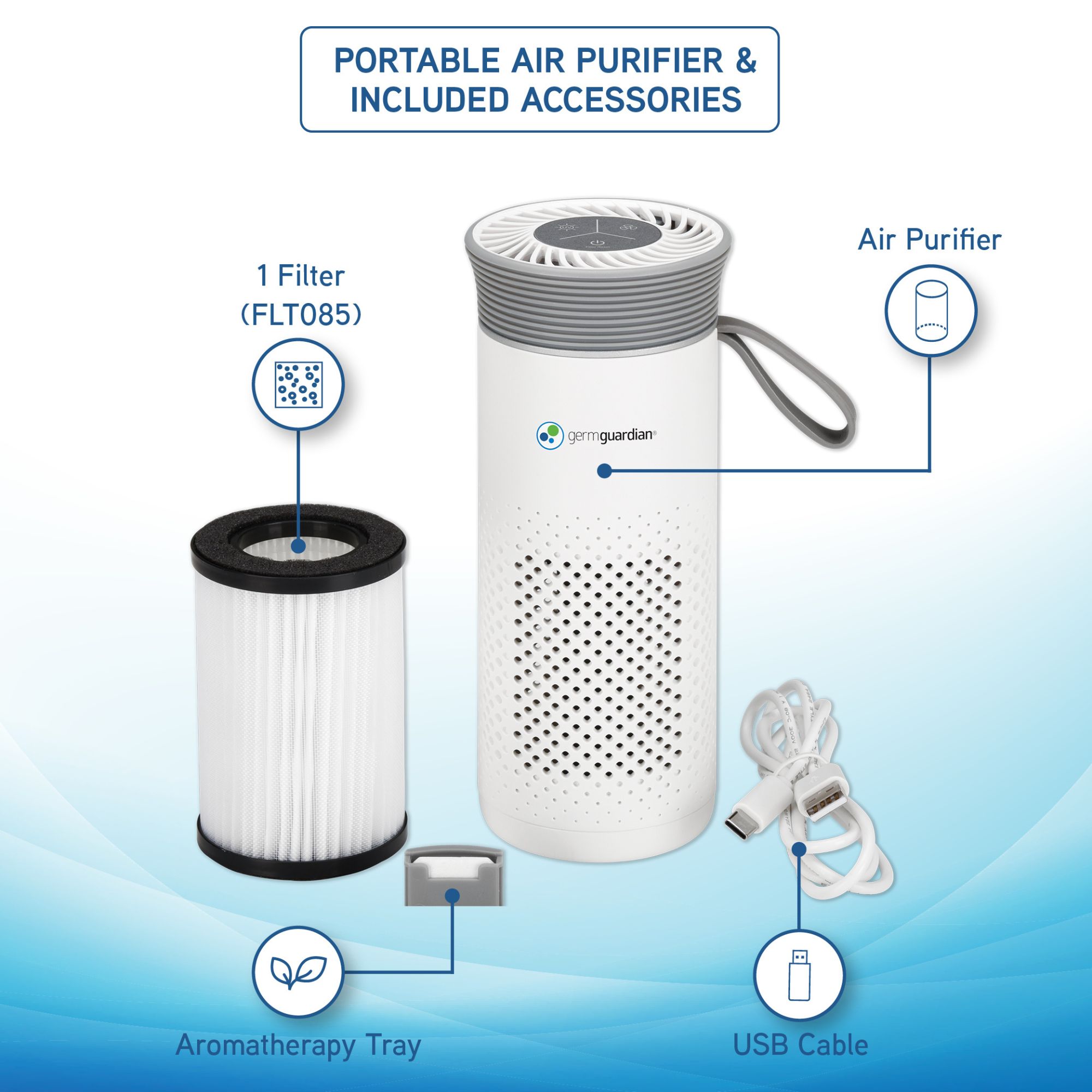 Improve your air quality wherever you go with the GermGuardian Portable Air Purifier. Perfect for allergy sufferers, the filter captures dust and allergens, while the UV-C light helps reduce germs. The UV-C light technology works to reduce airborne bacteria, viruses, germs, and mold spores. The compact and stylish air purifier is 7" tall. It is lightweight and ideal to use in the car, studio, bathroom, office, camping, and traveling. Equipped with an aromatherapy tray, you can freshen the air with your favorite essential oil. Includes 2 fan speeds, and a light indicator to let you know when it is time to change the filter.