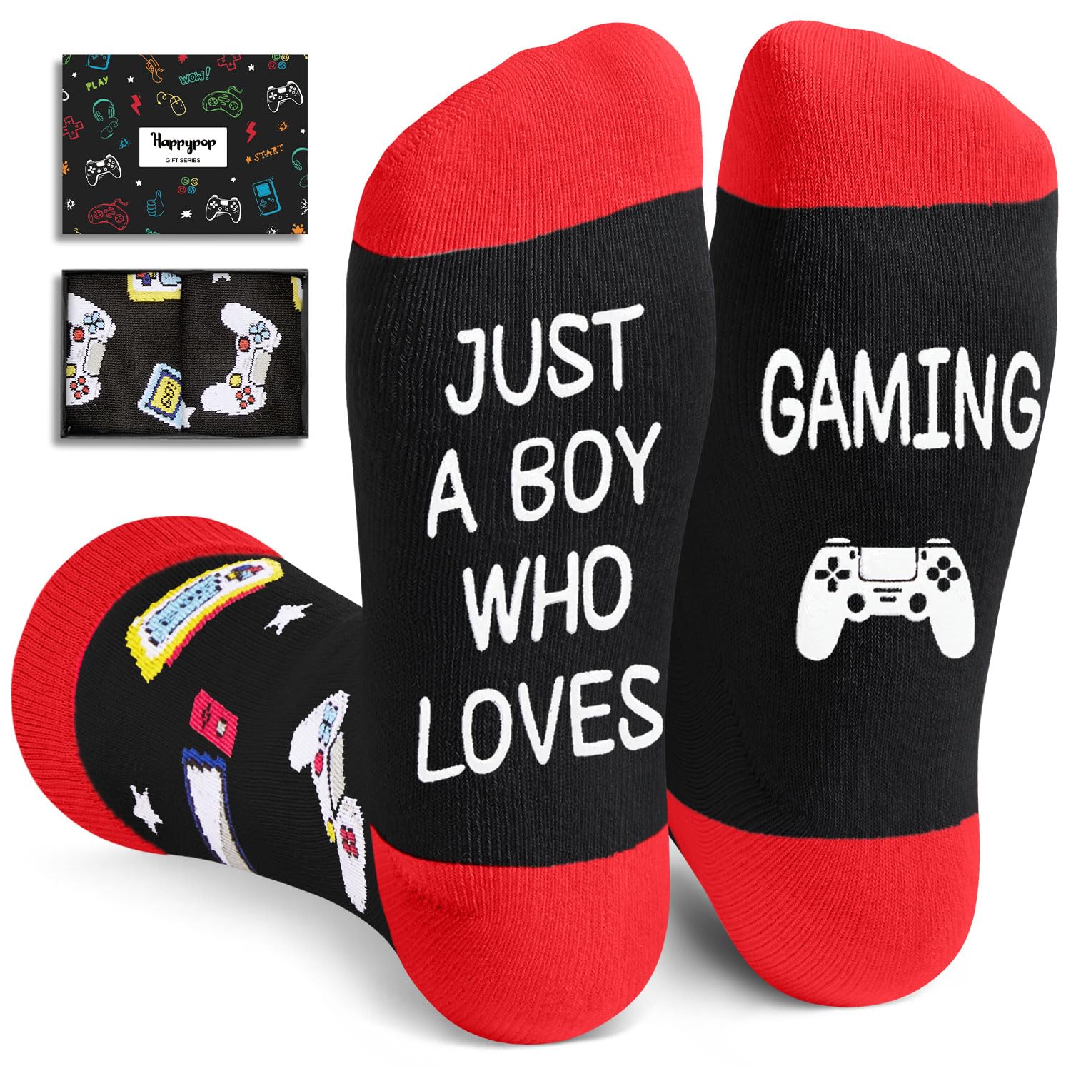 - GAMING SOCKS: Take a look at these pair of black gamer socks featuring gamepad, along with a funny saying, "JUST A BOY WHO LOVES GAMING".