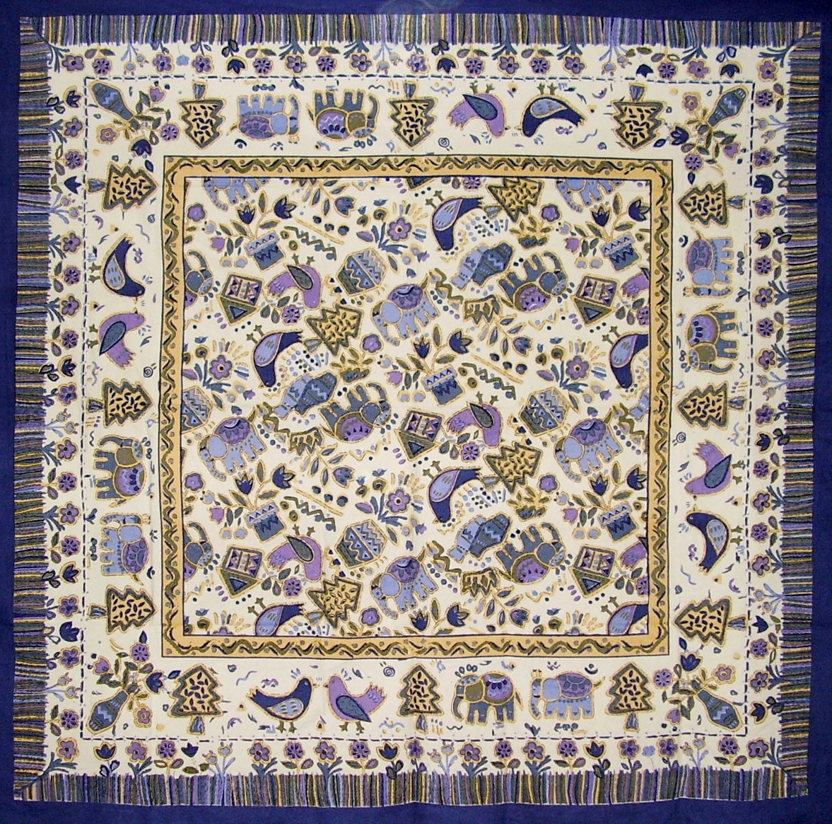 flowers. Colors are deep royal blue, purple, violet, gray and yellow-gold on a
