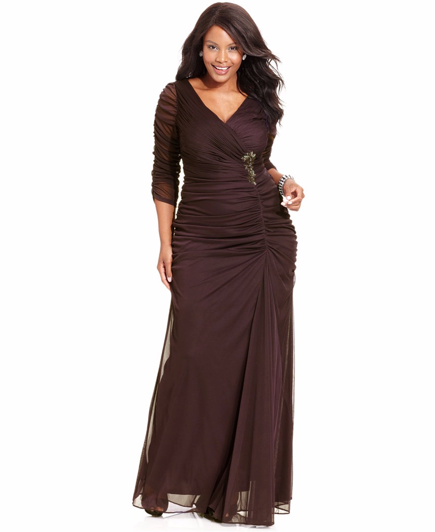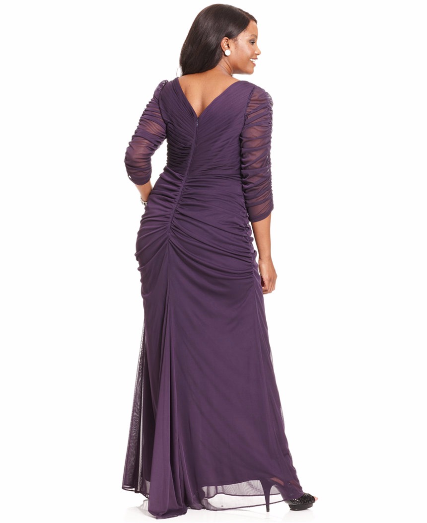 Ruched mesh overlays a statuesque V-neck gown fashioned with sheer three-quarter sleeves and a beaded floral embellishment that anchors the gathered waist.