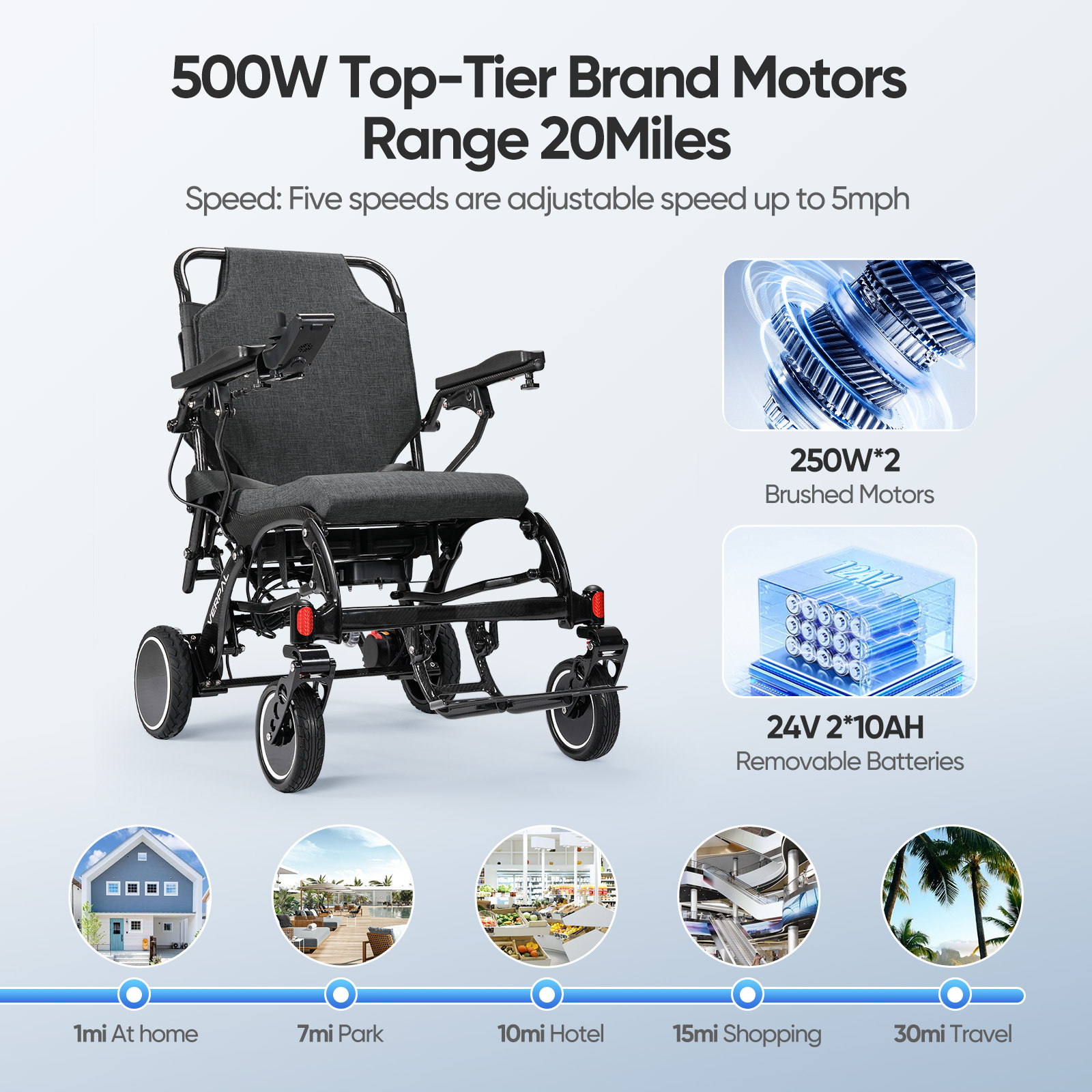 Impressive Range and Quick Charging: Equipped with high-capacity lithium-ion batteries and a powerful 250W dual motor, this motorized wheelchair offers a maximum speed of 6 km/h and a travel range of up to 20 miles. Charging takes only 4 to 6 hours, ensuring you're ready for your next adventure.