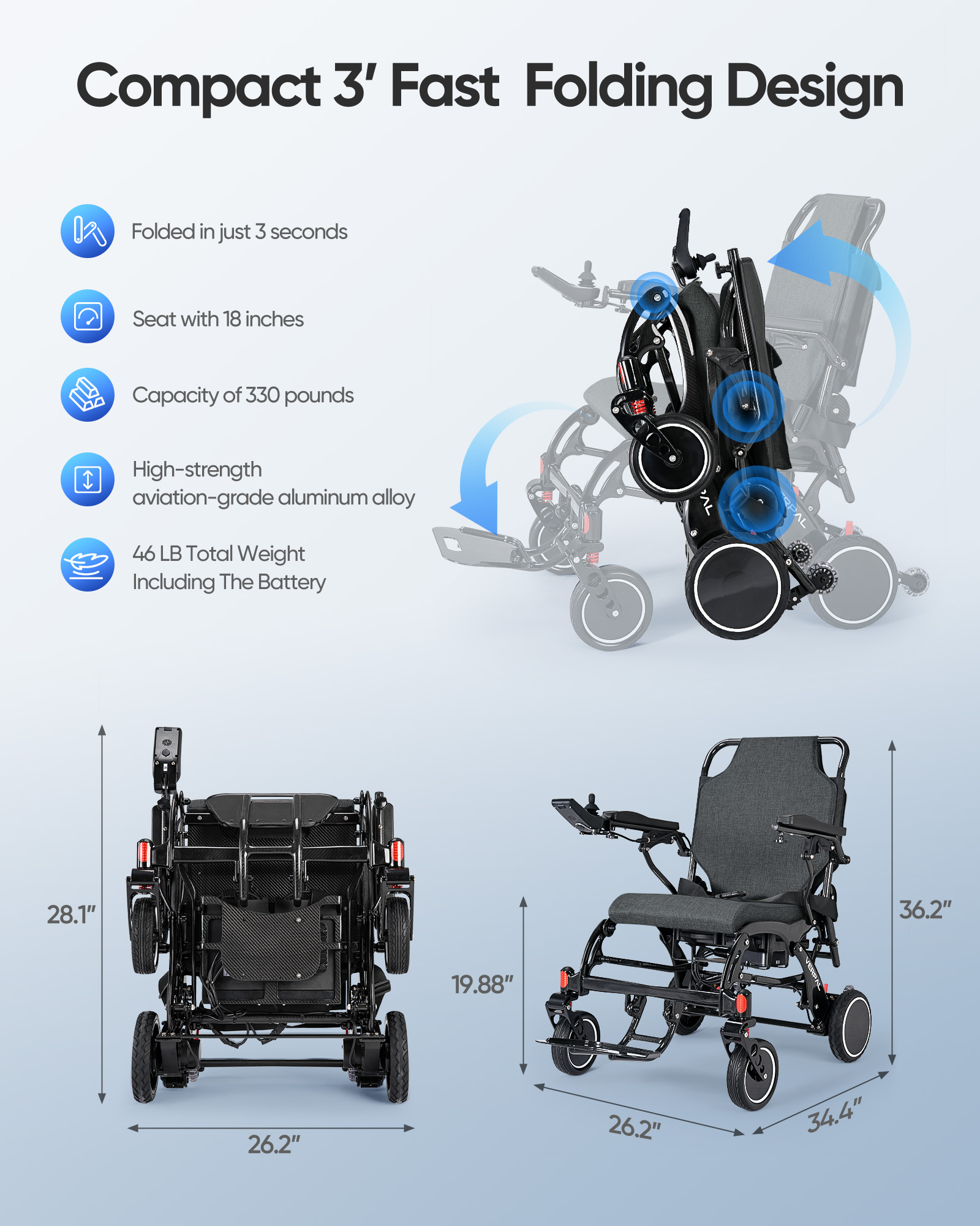 Lightweight and Effortless Operation: Experience unparalleled convenience with our adult electric wheelchair, crafted from 100% carbon fiber. Weighing just 46lbs, it’s the lightest electric wheelchair available. With a quick 1-second fold, it easily fits into various vehicle trunks and can be effortlessly transported like a suitcase, making it ideal for daily storage and transport.