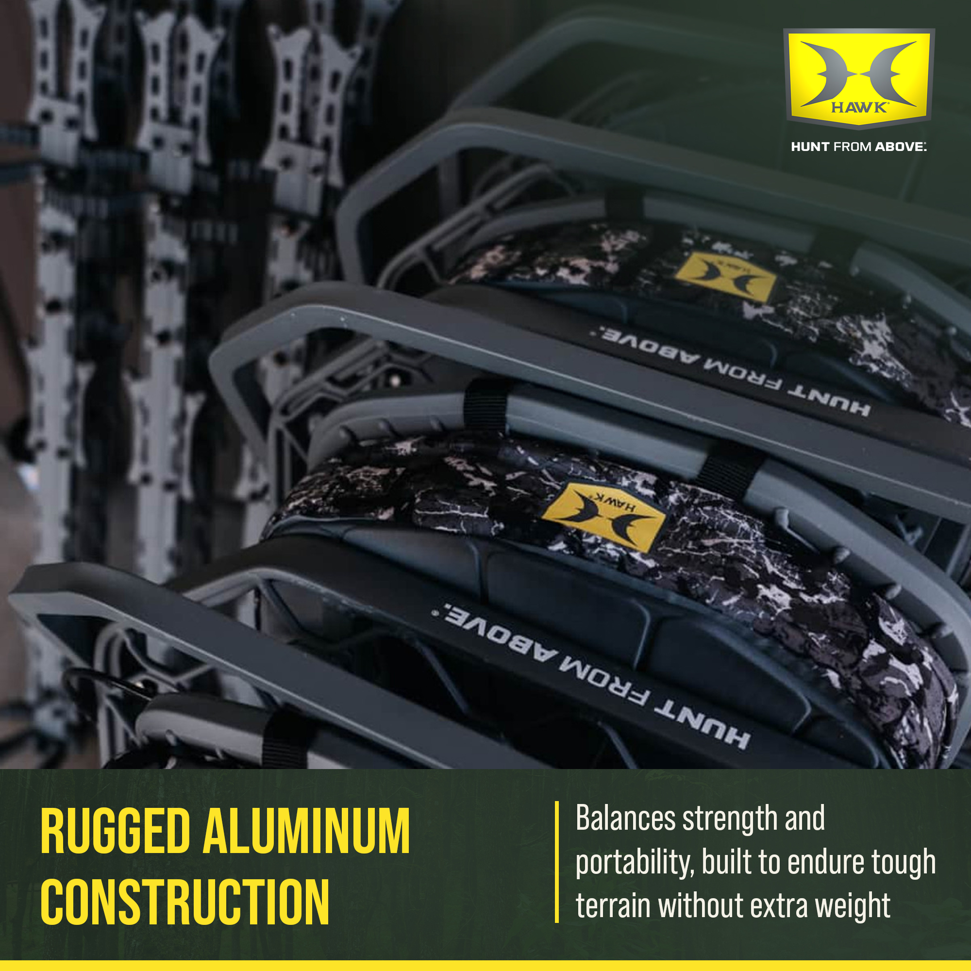 Each Hawk item features ultra-light aluminum construction to minimize carry weight while maintaining maximum strength. Whether it's a tree stand, climbing stick, or platform, you'll benefit from intuitive, quick-attach systems like snap pins, auto-leveling posts, or Tree Digger Teeth, making setup and takedown fast and quiet. Many components fold flat or nest together, saving room in your backpack and making them ideal for run-and-gun hunting in challenging terrain.