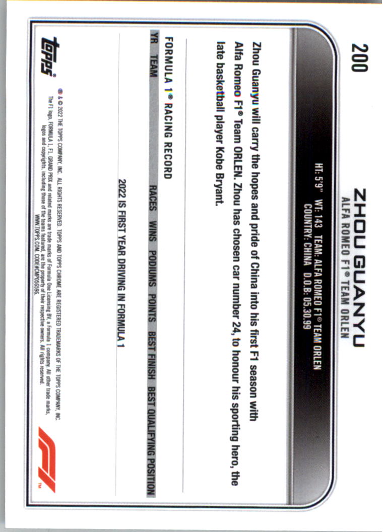 2022 Topps Chrome Formula 1 Checker Flag Refractors #200 Zhou Guanyu F - RAC