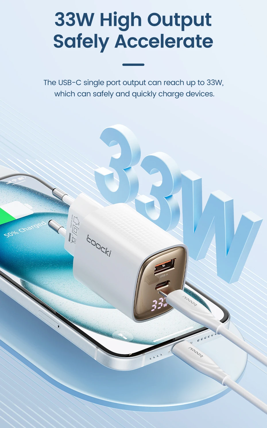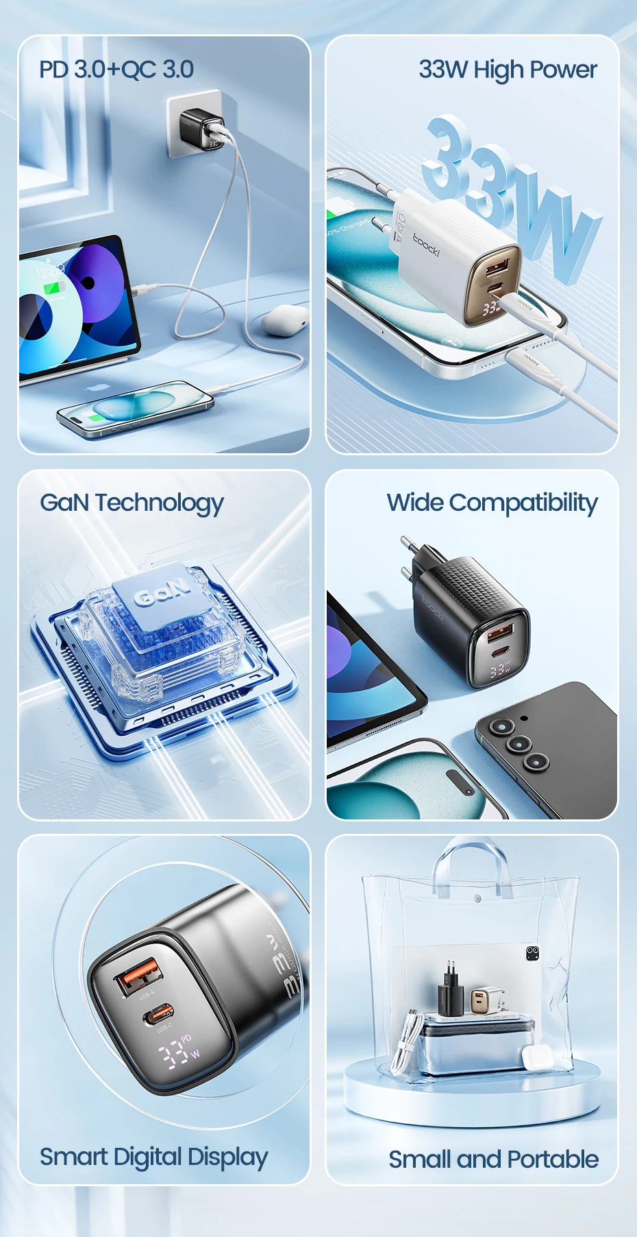 ⚡ 33W GaN USB-C Fast Charger with Digital DisplayNext-Gen Charging Technology with Real-Time Monitoring 🔋 Key FeaturesAdvanced GaN TechnologyGallium Nitride design delivers 33W fast charging in a compact size - 40% smaller than traditional chargers while staying cooler and more efficient. Real-Time Digital DisplayBuilt-in LED screen shows voltage and current during charging, letting you monitor charging status and verify optimal power delivery at a glance. Universal USB-C CompatibilityWorks with Samsung Galaxy, Xiaomi, Google Pixel, tablets, wireless earbuds, and all USB-C powered devices. Supports PD and QC fast charging protocols. Travel-Ready DesignInternational voltage support (100-240V) makes this the perfect travel companion. Ultra-compact form factor fits easily in any bag or pocket. 📋 Technical Specifications