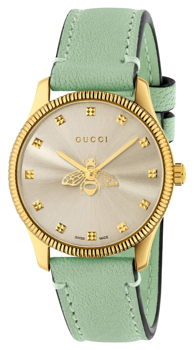 Enriched with signature motifs of the fashion house, Gucci's G-Timeless collection blends tradition, innovation, and contemporary design. This ladies' G-Timeless features a 29 mm yellow gold PVD-coated stainless steel case that holds a sunray silvery gold-tone dial under a scratch-resistant sapphire crystal. It has matching yellow gold-tone baton hands and a metallic bee motif as its seconds hand, an archival Gucci code first introduced in the 1970s. Subtle expressions of the brand's Gucci lettering are laid out just below the 12 o'clock position. Other aesthetic and functional details include the applied faceted squares as hour markers, a fluted and fixed bezel, and a fluted crown signed with the distinctive Gucci emblem. It is fitted with a green leather strap and secured by a yellow gold PVD-coated steel signed buckle. The solid caseback is engraved with the Gucci bee motif and lettering, which houses a reliable Swiss quartz movement and is water-resistant up to 50 meters/165 feet.