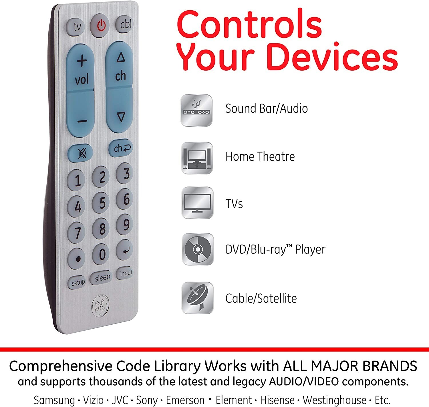 Control up to 2 audio/video components such as TVs, Blu-ray/DVD players, cable/satellite receivers, Roku boxes, and other streaming media players, sound bars, and more