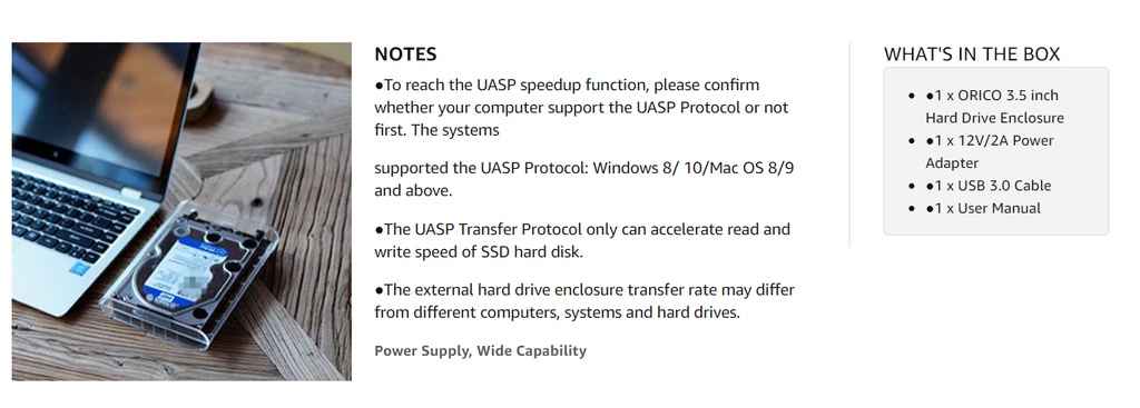✔[5Gbps Fast Transfer Rate]--Adopt SATA revision 3.0 5Gbps bridging solution, meanwhile USB HDD Enclosure 3.5 supports UASP accelerated transfer protocol and TRIM accelerated command, optimizes CPU usage and greatly improves hard drive transfer efficiency. The usb3.1 sata enclosure also features USB2.0 and USB1.1 ports